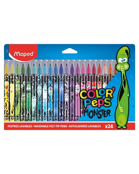 Caracteristicas:Embalagem de papelão com 24 canetinhas coloridas Monster Color'Peps. Encontre este kit de volta às aulas indispensável em uma versão monstruosamente divertida e de alta qualidade desenhada pela Maped. De desenhar em casa a colorir seu mapa geográfico na escola, esta bolsa com sua escolha de 24 cores segue seu aluno em qualquer lugar! Os marcadores estão em conformidade com os regulamentos de brinquedos para uso seguro. Cores brilhantes e intensas, em qualquer lugar, a qualquer hora, graças aos marcadores da linha Color'Peps Monster!- Contém 24 cores- Pontas resistentes à secagem (1 semana sem tampa)- Pontas bloqueadas contra afundamento- Tinta facilmente lavável* As especificações podem ser alteradas sem aviso prévio ** Imagem meramente ilustrativa.
