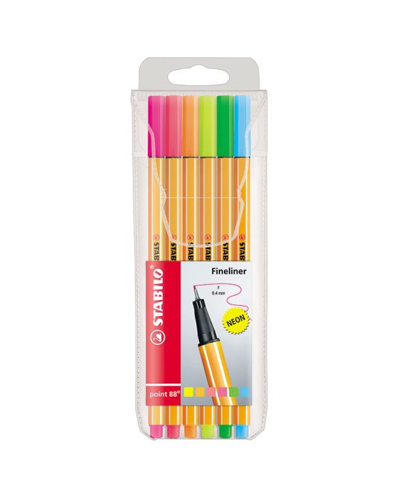 Caracteristicas:-A tradicional caneta Stabilo 88 em um estojo com 6 cores Neon:-amarelo neon, azul neon, verde neon, vermelho neon, laranja neon, rosa neon-Caneta Extra fina ideal para traços finos.-Tampa ventilada-Ponta sintética.-Ponta com reforço metálico-Traço 0,4mm -Tinta a base de água -Alto rendimento-Longa duração-Secagem rápida.* As especificações podem ser alteradas sem aviso prévio ** Imagem meramente ilustrativa
