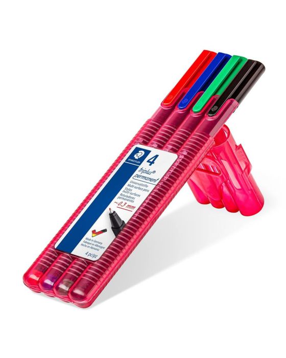 Caracteristicas- Fineliner permanente com ponta de metal para quase todas as superfícies- Formato triangular ergonômico- Ponta superfina para projetos precisos e desenhos em estilo filigrana (filigree)- À prova d'água- Disponível em caixa STAEDTLER stand-up- Disponível em 4 cores- Traço de aprox. 0.3 mm de largura* As especificações podem ser alteradas sem aviso prévio ** Imagem meramente ilustrativa