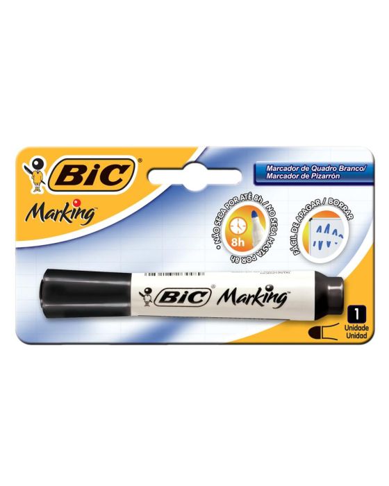 Características:Escreva e apague o quadro branco com facilidade graças ao Marcador Quadro Branco BIC Marking! Fácil de apagar apesar da cor da tinta ser bem viva. Sua ponta redonda é muito resistente, possibilita uma escrita firme, sem afundar. Seu design é diferenciado. A BIC oferece excelentes produtos para acompanhar o volta ás aulas com excelência e liderança.Detalhes:- Marca: Bic;- Modelo: BIC Marking;- Referência: 904204;- Linha: Canetas Quadro Branco;- Cores: Verde claro, Azul turquesa, Rosa e Roxa;- Ponta: Redonda;- Traço: 2 - 6mm;- Contém: 1 blister com 4 cores do produto;- Formato corpo: Redondo;- Não seca mesmo sem tampa por até 6 horas;- Cores vivas;- Recarregável;- Fácil de apagar;- Marca super vísivel.Fabricado no Brasil | Prazo de validade indeterminado.Ideal para:- Ideal para escrever em quadro branco.Composição:- Fabricado em Ponta redonda de poliéster, tinta a base de álcool, feltro: poliéster, corpo: plástico.Armazenamento:- Armazenar na posição horizontal. Após o uso tampe;- Evite altas temperaturas e exposição direta aos raios solares;- Armazenar em local seco e arejado.Conteúdo: 1 Caneta Quadro Branco Preta Recarregavel Bls C/1 Bic.ATENÇÃO! NÃO RECOMENDÁVEL PARA CRIANÇAS DE ATÉ 4 (QUATRO) ANOS POR CONTER PARTE(S) PEQUENA(S) QUE PODE(M) SER ENGOLIDA(S) OU ASPIRADA(S) E PONTA(S) AGUDA(S) FUNCIONAL(IS). CRIANÇAS ENTRE 5 (CINCO) E 8(OITO) ANOS SOMENTE DEVE UTILIZAR SOB SUPERVISÃO DE UM ADULTO.* As especificações podem ser alteradas sem aviso prévio ** Imagem meramente ilustrativa.
