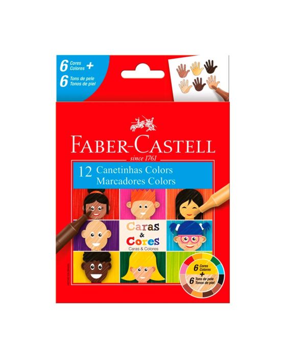 Caracteristicas:Dê um toque a mais nos seus desenhos com as canetas hidrográficas da FaberCastell. São canetinhas que valorizam a diversidade étnico-racial e cores mais vivas e grande durabilidade!Detalhes:- Marca: Faber-Castell.- Modelo: Caras e Cores.- Referência: 150112CCZF.- Linha: Canetas Hidrográficas.- Cores: 12 cores (6 Cores regulares + 6 tons de pele). - Contém: 1 estojo com 12 cores.- Ponta média.- 6 cores regulares, 6 tons de pele: Valorização da diversidade étnico-racial.- Formulação com corantes de alta qualidade cores mais vivas e grande durabilidade.- Tinta lavável na maioria dos tecidos.- Estojo prático.- Cores mais vivas.- Grande durabilidade.ATENÇÃO:O produto não é removivel de papéis e pintura de parede, superficies plásticas, madeiras e outros materiais os quais não podem ser lavados.* As especificações podem ser alteradas sem aviso prévio ** Imagem meramente ilustrativa.