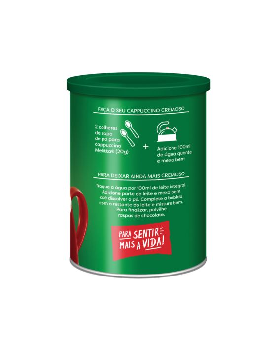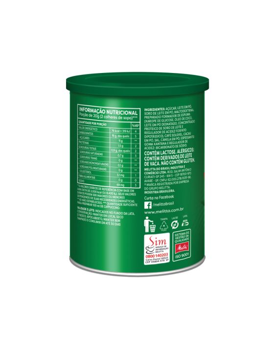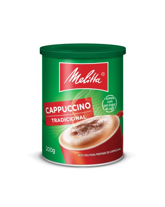 Características:- Café Capuccino- Marca Melitta- Peso: 200gIngredientes:Açúcar, leite integral, leite desnatado, café solúvel, cacau, estabilizante bicarbonato de sódio, espessante carragena, aromatizante, emulsificante lecitina de soja e regulador de acidez fosfato monossódico. Não Contém Glúten, nem lactose* As especificações podem ser alteradas sem aviso prévio** Imagem meramente ilustrativa.