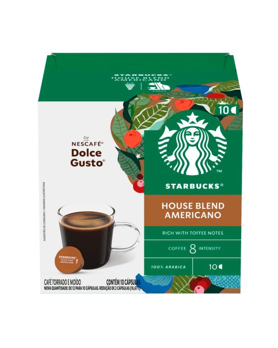 Características:Rico em notas de caramelo, descubra o Starbucks® House Blend com seu equilíbrio perfeito de aroma, corpo e sabor, criado para as máquinas Starbucks® Dolce Gusto®.Detalhes:- Marca: Starbucks® Nescafé® Dolce Gusto®;- Linha: Cápsula;- Sabor: House Blend Americano;- Intensidade: 8;- Origem: Brasil;- Contém: 1 caixa com 10 unidades;- Quantidade: 10 cápsulas de 8,5g;- Peso da embalagem: 141g;- Compatibilidade: Máquinas Dolce Gusto® Geração 1;- 100% Arábica.Indústria Brasileira.Cápsulas:- Quantidade de Cápsulas: 10 Cápsulas de café;- Rendimento: 10 porções;- Porção: 8,5g.Faz:- Faz no total: 220ml;- Tamanho de xícara: Grande.Ingredientes:- Café Torrado Moído.Armazenagem:- Manter em local fresco e arejado.Medidas:- Dimensões da embalagem: 11,1 x 11,1 x 10cm (CxLxA);- Peso: 141g.Recicle:- Se você tem acesso a coleta seletiva, descarte junto aos materiais recicláveis.- Caso não tenha, encontre o ponto de entrega mais próximo de você: https://www.nescafe-dolcegusto.com.br/sustentabilidadendgALÉRGICOS: CONTÉM DERIVADOS DE LEITE E SOJA. PODE CONTER TRIGO, CEVADA E AVEIA.CONTÉM LACTOSE. CONTÉM GLÚTEN.* As especificações podem ser alteradas sem aviso prévio ** Imagem meramente ilustrativa.