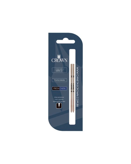 Caracteristicas:Carga Crown Esferográfica Azul e Preta Padrão Mini D1. Qualidade Suiça com Ponta Média (para canetas Cristal esferografica).- Cor: Azul e preta- Modelo: CA16005N- Tipo de carga: Mini D1* As especificações podem ser alteradas sem aviso prévio ** Imagem meramente ilustrativa