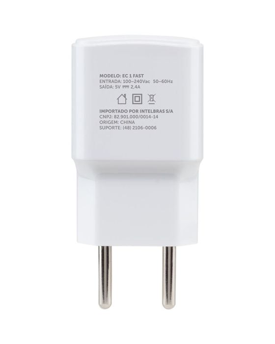 Caracteristicas:O EC 1 Fast é um carregador USB com saída de 2,4A, que proporciona carregamento até 2 vezes mais rápido. Ideal para recarregar a bateria de smartphones, tablets, fones de ouvido, power banks, smartwatches, caixas de som portátil, e outros dispositivos com conexão USB. Fornece carregamento seguro, com proteção contra surtos de tensão e sobrecarga.- Carregamento até 2 vezes mais rápido- Compatível com qualquer dispositivo com conexão USB- Bivolt automático- Não vicia a bateria do dispositivo- Proteção contra surtos de tensão e sobrecargaEspecificações técnicas- Entrada: 100 à 240Vca 50/60Hz 0,4 A máximo (bivolt automático)- Saída: USB-A: 5V 2,4A (máximo)- Temperatura em operação: 0 à 40ºC- Temperatura em armazenamento: -40 à 70ºC- Dimensão do produto (L×A×P): 38,5 × 22 × 60,5mm- Peso do produto: 39g- Dimensão da embalagem (L×A×P): 136 × 195 × 33,5mm- Peso da embalagem: 90g* As especificações podem ser alteradas sem aviso prévio ** Imagem meramente ilustrativa.