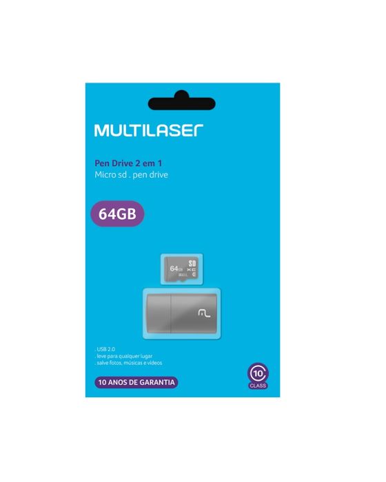 Caracteristicas:Ideal para gravação de vídeos em FULL HD- Capacidade: 64GB- Classe 10- Compatibilidade: USB 2.0 e Micro USB- Taxa de transferência leitor USB: Até 480 Mb/s- Taxa de transmissão de dados Cartão: 10MB/s, gravação até 30MB/s leitura- Dimensões Leitor de cartão : 47 x 20 x 11mm- Dimensões cartão Micro USB: 15,0 x 11,0 x 1,0mm- Peso total: 3g- Garantia: 10 Anos contra defeitos de fabricação- Conteúdo da embalagem: 1 Cartão de memória Micro SD e 1 adaptador de cartãoObs: Função Pen drive utilizando o cartão Micro SD no adaptador USB 2.0* As especificações podem ser alteradas sem aviso prévio ** Imagem meramente ilustrativa