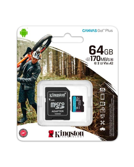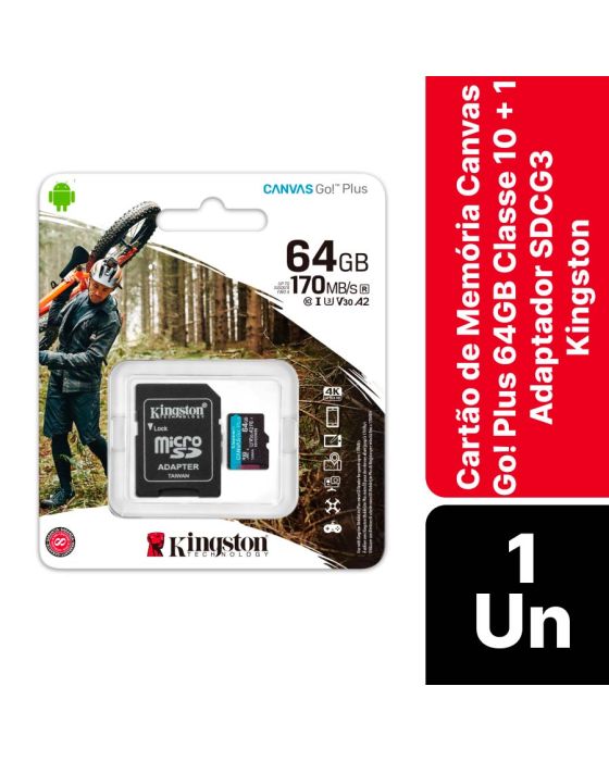 Características:Os cartões microSD Canvas Go! Plus da Kingston são para os aventureiros que estão sempre em movimento procurando o momento perfeito para capturar uma imagem. Com velocidades superiores de transferência de até 170MB/s, o cartão microSD Canvas Go! Plus acelera seu fluxo de trabalho e sua eficiência para que você tenha mais tempo para planejar sua próxima aventura. Com desempenho de velocidade V30 e U3, faça vídeos Ultra-HD 4K fantásticos sem se preocupar com baixas velocidades, ou então tire fotografias de ação perfeitas e consistentes. O microSD Canvas Go! Plus suporta a Classe de Desempenho Aplicativo A2 (A2 Application Performance Class) para agilizar seu fluxo de trabalho com desempenho mais rápido do aplicativo em smartphones e tablets. Há um adaptador SD opcional para maior versatilidade ao usar dispositivos compatíveis com cartões SD. Considere o mundo sua inspiração e use sua criatividade em qualquer lugar com o microSD Canvas Go! Plus.Detalhes:- Marca: Kingston;- Modelo: Canvas Go! Plus;- Referência: SDCG3/64GB;- Linha: Cartões de Memória;- Cor: Preto;- Capacidade: 64gb;- Desempenho: 170/70MB/s Leitura/Gravação (64GB);- Formato: exFAT;- Contém: 1 unidade do produto;- Padrão: Classe 10, UHS-I, U3, V30, A2;- Velocidades mais rápidas - a classe 10 UHS-I acelera até 100 MB/s;- Otimizado para uso com dispositivos Android - Desempenho aprimorado quando usado com um smartphone ou tablet Android;- Múltiplas capacidades - Até 512 GB para armazenar todas as suas fotos e vídeos memoráveis;- Durável - Para sua tranquilidade, o cartão foi extensivamente testado e provado ser à prova d'água, à prova de temperatura, à prova de choque e vibração e à prova de raios X.Ideal para:- Dispositivos móveis Android, câmeras de ação, drones e produção de vídeo 4K.Tensão:- Tensão 3.3V. Temperatura:- Temperatura de operação: -25 ° C ~ 85 ° C;- Temperatura de armazenamento: -40 ° C ~ 85 ° C.Medidas:- Dimensões do MicroSD: 1,1 x 1,5 x 0,1cm ( x x x);- Dimensões do Adaptador SD: 2,4 x 3,2 x 0,21cm ( x x x);- Peso: 8g.Conteúdo da embalagem: 1 Cartão de Memória Canvas Go! Plus 64GB Classe 10 e 1 Adaptador SDCG3 Kingston.Garantia do fornecedor: Vitalícia.* As especificações podem ser alteradas sem aviso prévio ** Imagem meramente ilustrativa.