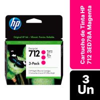 Características:Imprima documentos com cores nítidas e intensas. As tintas HP originais oferecem uma resistência extraordinária à descoloração e confiabilidade e desempenho superiores.A qualidade da HP que você conhece e confia agora mais acessível do que nunca. Imprima documentos e fotos resistentes à água e manchas e economize em impressão freqüente com os cartuchos originais HP.Detalhes:- Marca: HP;- Modelo: 712;- Referência: 3ED78A;- Linha: Cartuchos;- Cor: Magenta;- Volume cartucho: 29ml cada;- Contém: 1 embalagem com 3 unidades do produto;- Tecnologia de impressão: Jato de Tinta;- Produto Original.Fabricado na Malásia.Impressoras Compátiveis:- Modelos Impressora HP DesignJet T210, Impressora HP DesignJet T230, Impressora HP DesignJet T250, Impressora HP DesignJet T630, Impressora HP DesignJet T650 e Impressora HP DesignJet Studio.Medidas:- Dimensões embalagem: 12 x 4,7 x 12,4cm (CxLxA).Descarte de Cartuchos e Toners:- Você pode fazer o descarte com ajuda do ReCiclo, um projeto da Contabilista através da Contabilista Responsável, basta enviar os seus resíduos para a nossa Central de Distribuição*, se você é de Curitiba ou de Joinville, pode ir até uma de nossas lojas ou preencher o formulário disponível no site para solicitar retirada de materiais.Acesse o Link para verificar as marcas que reciclamos e nossos endereços: https://www.contabilistaresponsavel.com.br/reciclo.* Enviar conteúdo aos cuidados do Setor de Reciclagem.** Atenção: Cartuchos e Toners compatíveis não entram no descarte do ReCiclo, apenas suprimentos originais de nossos parceiros (confira a lista no link acima).Conteúdo da embalagem: 3 Cartuchos de Tinta 712 3ED784.* As especificações podem ser alteradas sem aviso prévio ** Imagem meramente ilustrativa.