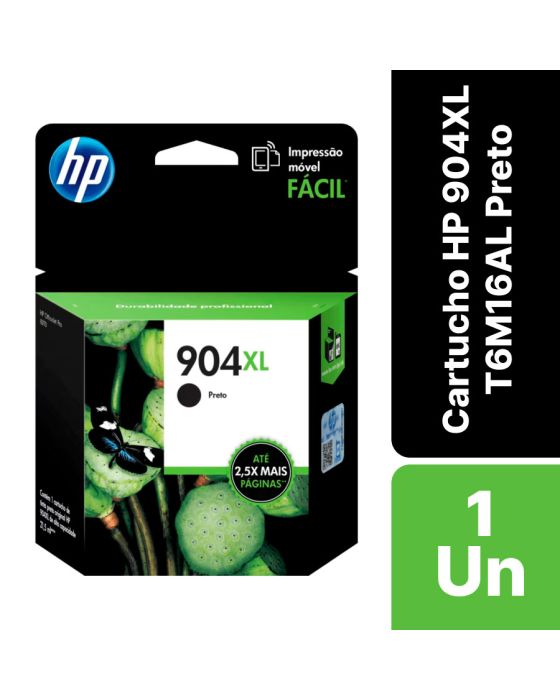 Características:Com Cartucho HP 904 Preto, você irá imprimir cores profissionais em todas as páginas e economizar em comparação com as impressoras a laser. Produza documentos e materiais de marketing realísticos com excelentes cores vibrantes por um menor custo por página, e recicle facilmente seus cartuchos.Detalhes:- Marca: HP;- Modelo: 904XL;- Referência: T6M16AL;- Cor da tinta: Preto;- Volume: 21,5ml;- Rendimento: Aproximadamente 825 páginas;- Contém: 1 unidade do produto;- Tecnologia de impressão: Jato de Tinta;- Cobertura: Aproximadamente 5% cobertura;- Produto Original.Fabricado na Malasia.Compatível com:- Multifuncional HP OfficeJet 6950;- Multifuncional HP OfficeJet Pro 6960;- Multifuncional HP OfficeJet Pro 6970.Composição: - Tipos De Tinta: Água, solventes e pigmentos.Recomendações:- Não descarte em lixo comum.Medidas:- Dimensões da embalagem: 11,6 x 4,4 x 10cm (CxLxA);- Peso da embalagem: 0,08kg.Conteúdo da embalagem: 01 Cartucho HP 904XL T6M16L Preto.ATENÇÃO! CONSERVAR O PRODUTO FORA DO ALCANCE DE CRIANÇAS.* As especificações podem ser alteradas sem aviso prévio ** Imagem meramente ilustrativa.