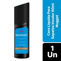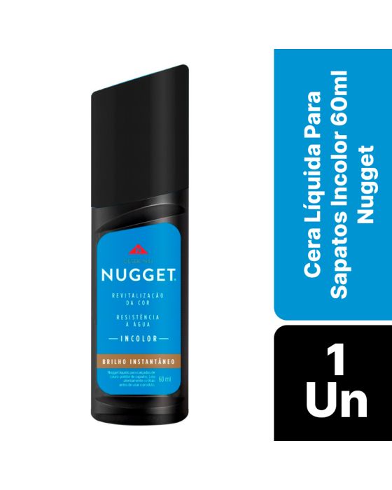Características:O Cera Líquida para Sapatos Incolor 60ml Nugget possui cuidado avançado proporcionando ao couro um brilho mais intenso e proteção, deixando seus sapatos como novos por muito mais tempo!Detalhes:- Marca: Nugget;- Modelo: Cera Líquida para Sapatos- Linha: Cera líquida;- Volume: 60ml;- Cor: Incolor;- Contém: 1 unidade do produto;- Revitalização da Cor;- Resistência à Água;- Brilho instantâneo;- Nova fórmula.Indústria Brasileira | Validade: 36 meses após a data de fabricação.Ideal para:- Sapatos de couro.Modo de uso:- Retire a poeira do couro, agite o produto tampado;- Pressione suavemente o aplicador sobre a superfície de couro até destravar a válvula de segurança e umedecer a esponja;- Cubra a superfície de couro com uma camada de Nugget Líquido e deixe secar por aproximadamente 30 minutos , não aplicar em excesso;- Após a aplicação do produto, assegure-se de que a peça de couro esteja completamente seca antes de usá-la. Recomendação:- Não aplicar o produto sobre superfícies texturizadas, metalizadas ou de verniz;- Mantenha o produto em sua embalagem original.Composição:- Emulsão de Polímero Acrílico, Cera de Polietileno, Álcoois Etoxilados, Coadjuvantes, Atenuador de Espuma, Conservantes, Corantes e Veículos.ATENÇÃO: MANTENHA FORA DO ALCANCE DAS CRIANÇAS E DOS ANIMAIS DOMÉSTICOS.* As especificações podem ser alteradas sem aviso prévio ** Imagem meramente ilustrativa.