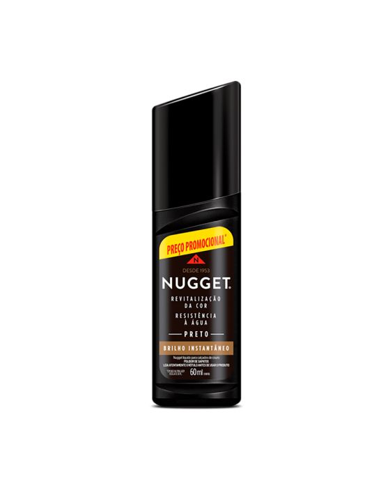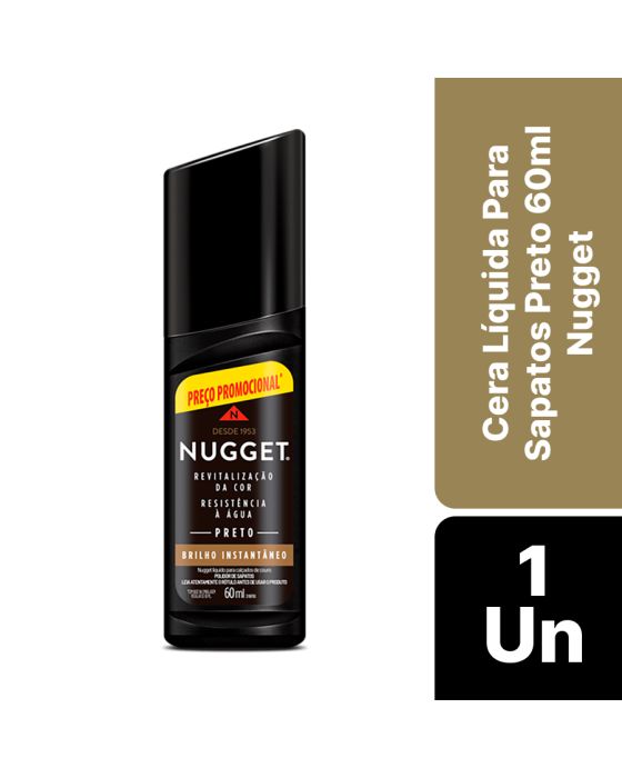 Características:O Cera Líquida para Sapatos Preto 60ml Nugget possui cuidado avançado proporcionando ao couro um brilho mais intenso e proteção, deixando seus sapatos como novos por muito mais tempo!Detalhes:- Marca: Nugget;- Modelo: Cera Líquida para Sapatos- Linha: Cera líquida;- Volume: 60ml;- Cor: Preto;- Contém: 1 unidade do produto;- Revitalização da Cor;- Resistência à Água;- Brilho instantâneo;- Nova fórmula.Indústria Brasileira | Validade: 36 meses após a data de fabricação.Ideal para:- Sapatos de couro.Modo de uso:- Retire a poeira do couro, agite o produto tampado;- Pressione suavemente o aplicador sobre a superfície de couro até destravar a válvula de segurança e umedecer a esponja;- Cubra a superfície de couro com uma camada de Nugget Líquido e deixe secar por aproximadamente 30 minutos , não aplicar em excesso;- Após a aplicação do produto, assegure-se de que a peça de couro esteja completamente seca antes de usá-la. Recomendação:- Não aplicar o produto sobre superfícies texturizadas, metalizadas ou de verniz;- Mantenha o produto em sua embalagem original.Composição:- Emulsão de Polímero Acrílico, Cera de Polietileno, Álcoois Etoxilados, Coadjuvantes, Atenuador de Espuma, Conservantes, Corantes e Veículos.ATENÇÃO: MANTENHA FORA DO ALCANCE DAS CRIANÇAS E DOS ANIMAIS DOMÉSTICOS.* As especificações podem ser alteradas sem aviso prévio ** Imagem meramente ilustrativa.