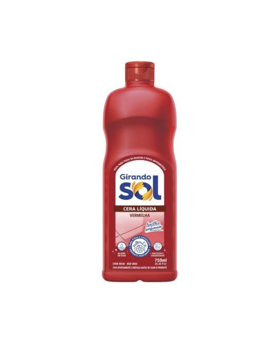 Caracteristicas:Cera Líquida GIRANDO SOL é ideal para madeira e pisos frios como:cerâmica, lajotas, linóleo, paviflex, vulcapiso, ladrilhos, pastilhas, borracha, granito, mármore, pedra ardósia ou qualquer outro piso impermeável. Na conservação de pisos vitrificados comverniz, poliuretano ou similares. - Cor: vermelha - Ideal para madeira e pisos frios - Conserva pisos vitrificados com verniz, poliuretano e similares.Modo de Usar:Uso Puro : Lave o piso com uma mistura de água com um limpador amoniacal ou detergente. Sobre o piso limpo e seco, aplique uniformemente a Cera Líquida GIRANDO SOL com um pano e deixe secar. Se desejar um brilho mais intenso, lustre com enceradeira ou com uma flanela limpa.Uso Diluído (Limpeza do piso ou assoalho)Dilua em um balde 2 colheres de sopa (30ml) de Cera Líquida GIRANDO SOL, para cada litro de água. Se desejar mais brilho, aumente a quantidade do produto. Molhe um pano limpo na solução, aplique sobre o piso e deixe secar. Obs.: Lave a colher medida antes de reutilizá-la para outros fins.Cuidados - Cuidado: irritante para os olhos e mucosas- Evitar contato prolongado com a pele, lavar as mãos após o uso- Manter fora do alcance de crianças e animais domésticos- Mantenha o produto em sua embalagem original- Em caso de contato com os olhos, lave-os com água- Se inalado em excesso, leve a pessoa a um local bem ventilado- Em caso de ingestão, não provoque vômito e consulte imediatamente o Centro de Intoxicações ou o seu médico, levando o rótulo do produto.Composição Química:- Composição: Parafina, Cera de Carnaúba, Monoestearato de Sorbitano, Ácido Esteárico, Monoetanolamina, Monoestearato de Glicerina, Álcool Ceto Estearílico, Resina, Amoníaco, Preservante, Corante, Fragrância e Água.* As especificações podem ser alteradas sem aviso prévio ** Imagem meramente ilustrativa
