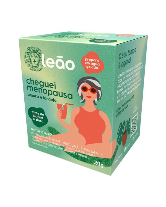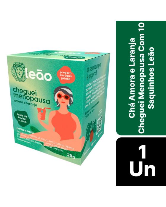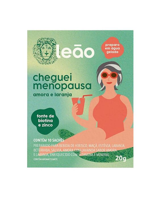 Características:Você não está sozinha!A Leão lança uma linha focada no autocuidado feminino, entregando uma nova experiência de consumo para todas as fases da vida das mulheres.O seu tempo é agora!Um dia a menopausa chega e ela pode ser vivida com muita potência e fluidez. Por isso a Leão criou uma bebida refrescante com biotina e zinco para te acompanhar nesta fase da sua vida. Beba geladinha!Este é o momento para cuidar de você.Detalhes:- Marca: Leão;- Linha: Chás;- Linha: Cheguei Menopausa;- Aroma: Amora e Laranja;- Sabor: preparado de Bebida de Hibisco, Maçã, Estévia, Laranja, Beterraba, Sálvia, Amora com Lavanda, Sabor Amora e Laranja, Enriquecido com Vitamina e Mineral - Peso: 20g;- Quantidade de sachês: 10 sachês;- Sachês: 2g cada envelope;- Contém: 1 caixa com 10 unidades do produto;- Fonte de Biotina e zinco;- Preparo em água gelada;- Os chás não possuem quantidade significativa de valor energético, proteínas, gorduras totais, gorduras saturadas, gorduras trans, fibra alimentar e sódio.- Chás são envelopados individualmente.Indústria Brasileira. | Validade: 14 meses após a data de fabricação.Ideal para:- Ideal para o café da manhã, tarde, ou intervalos, pode ser usado em refeitórios corporativos, restaurantes de hotéis, escolas, hospitais e clínicas.Modo de preparo:- Coloque 1 sachê em 240ml de água gelada ou natural;- Coloque o sachê e deixe em infusão em 5 minutos;- Adoce se preferir;- Após o preparo, consumir imediatamente.Armazenamento:- Conservar ao abrigo do Sol e Calor em local limpo, seco, arejado e sem odor.Importante!- Utilize água filtrada;- Consumir imediatamente após preparo ou guardar por no máximo 8 horas em recipiente limpo e sob refrigeração;- Usar a quantidade indicada de água é importante para garantir uma melhor experiência.Ingredientes:- Hibisco, Maçã, Estévia, Cascas de Laranja, Beterraba, Sálvia, Gluconato de Zinco, Lavanda, Biotina, Amora, Aromatizantes.Medidas:- Dimensões da embalagem: 7,3 x 8 x 9,5cm (CxLxA);- Peso: 48g.ALÉRGICOS: NÃO CONTÉM GLUTÉN.ATENÇÃO! MANTENHA FORA DO ALCANCE DE CRIANÇAS E DOS ANIMAIS DOMÉSTICOS.* As especificações podem ser alteradas sem aviso prévio ** Imagem meramente ilustrativa.