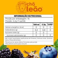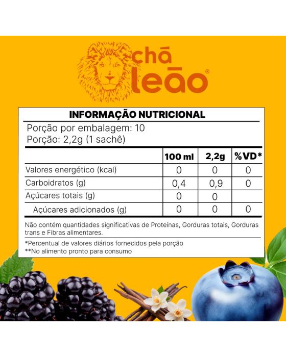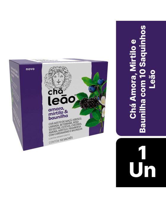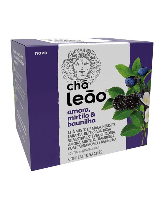 Características:A linha de Frutas e Flores da Leão possui a combinação de aromas e sabores, pensados especialmente para quem gosta de ter uma experiência diferente na hora de beber seu chá!.#FicadeBoa com Chás Leão!Detalhes:- Marca: Leão;- Linha: Chás;- Modelo: Amora, Mirtilo e Baunilha;- Sabor: Chá misto de maçã, Hibisco, Laranja, Beterraba, Rosa silvestre, Estévia, Chicória, Amora, Mirtilo, Framboesa com cardamomo e Baunilha;- Peso: 22g;- Quantidade de sachês: 10 sachês;- Sachês: 2,2g cada envelope;- Contém: 1 caixa com 10 unidades do produto;- Os chás não possuem quantidade significativa de valor energético, proteínas, gorduras totais, gorduras saturadas, gorduras trans, fibra alimentar e sódio.- Chás são envelopados individualmente.Indústria Brasileira. | Validade: 18 meses após a data de fabricação.Ideal para:- Ideal para o café da manhã, tarde, ou intervalos, pode ser usado em refeitórios corporativos, restaurantes de hotéis, escolas, hospitais e clínicas.Modo de preparo:- Despeje água quente (a 90ºC) em uma xícara de 240ml;- Coloque o sachê e deixe em infusão em 5 minutos;- Adoce se preferir;- Após o preparo, consumir imediatamente.Armazenamento:- Conservar ao abrigo do Sol e Calor em local limpo, seco, arejado e sem odor.Importante!- Utilize água filtrada;- Consumir imediatamente após preparo ou guardar por no máximo 8 horas em recipiente limpo e sob refrigeração;- Usar a quantidade indicada de água é importante para garantir uma melhor experiência.Ingredientes:- FRUTOS DE MAÇÃ (Pyrus malus L.), FLORES DE HIBISCO (Hibiscus sabdariffa L.), FRUTOS DE ROSA SILVESTRE (Rosa canina L.), CASCAS DE LARANJA DOCE (Citrus aurantium L.), RAÍZES DE BETERRABA (Beta vulgaris L.), FOLHAS DE ESTÉVIA (Stevia rebaudiana Bert), RAÍZES DE CHICÓRIA TOSTADA (Chicorium intybus L.) E AROMATIZANTES.Medidas:- Dimensões da embalagem: 7,8 x 7,2 x 8cm (CxLxA);- Peso: 35g.ALÉRGICOS: NÃO CONTÉM GLUTÉN.ATENÇÃO! MANTENHA FORA DO ALCANCE DE CRIANÇAS E DOS ANIMAIS DOMÉSTICOS.* As especificações podem ser alteradas sem aviso prévio ** Imagem meramente ilustrativa.