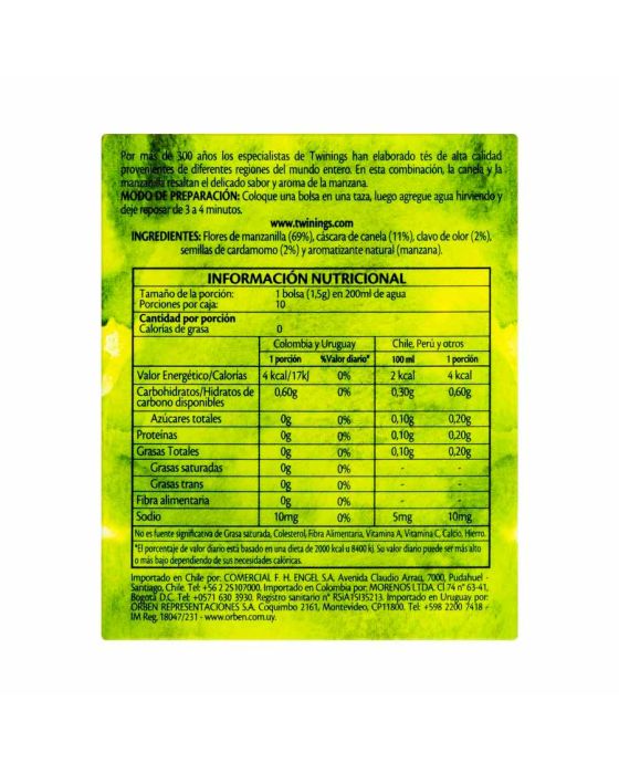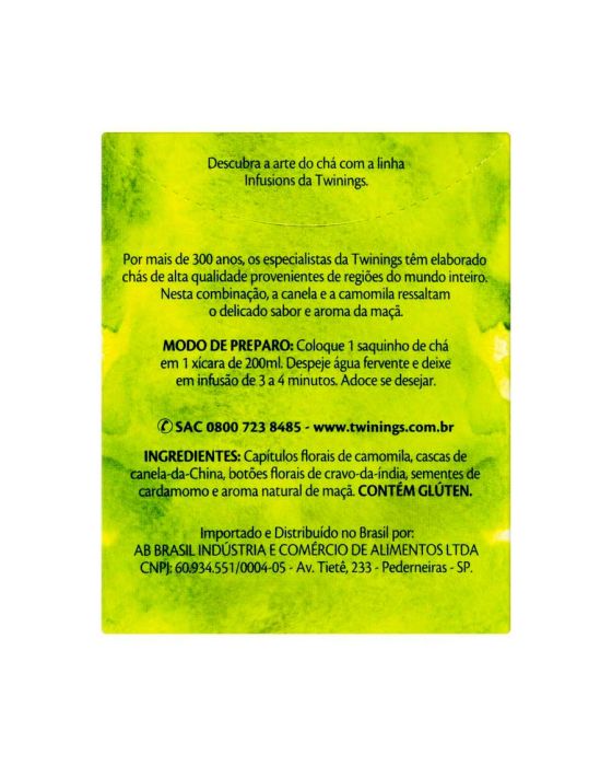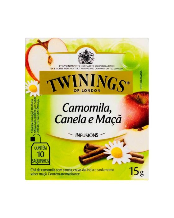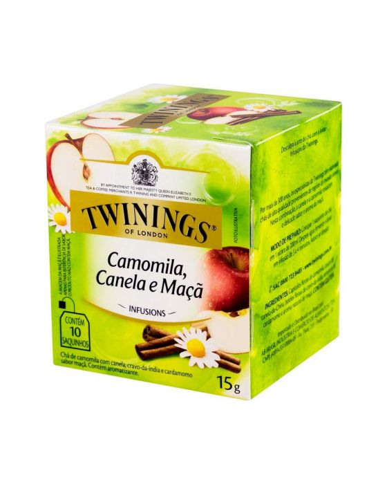 Características:Este blend é feito a partir de ingredientes clássicos que formam uma mistura perfeita. Esta infusão é uma suave combinação do aroma floral marcante da camomila misturado ao sabor suculento da maçã com um toque final de canela.- Peso: 15g- Contém 10 sachês- Não contém cafeínaIngredientes: Capítulos florais de camomila, cascas de canela-da-China, botões florais de cravo-da-Índia, sementes de cardamomo e aroma natural de maçã. CONTÉM GLÚTEN.* As especificações podem ser alteradas sem aviso prévio** Imagem meramente ilustrativa.