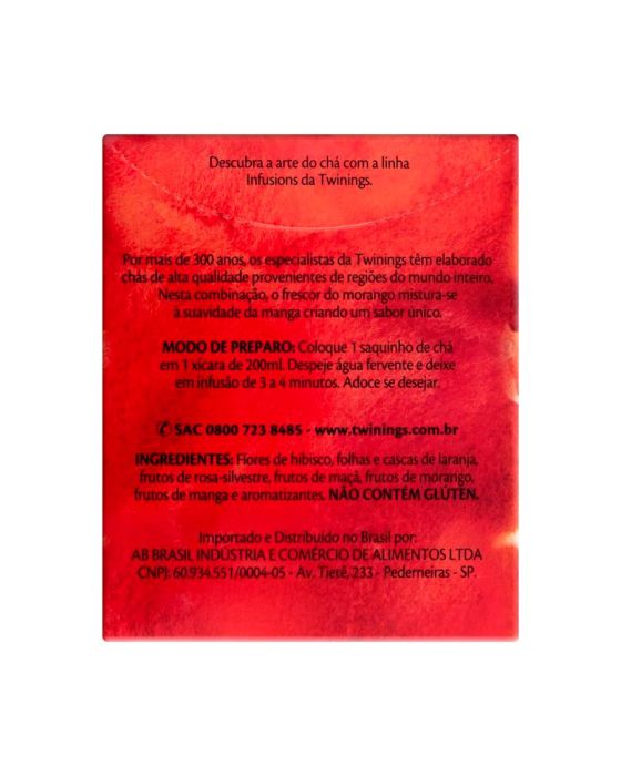 Características:Nesta infusão única da Twinings, o aroma marcante do morango mistura-se ao sabor suave e adocidado da manga, criando um sabor surpreendente ao paladar e perfeito para o clima brasileiro.- Peso: 15g- Contém 10 sachês- Não contém cafeínaIngredientes: Flores de hibisco, folhas e cascas de laranja, frutos de rosa-silvestre, frutos de maçã, frutos de morango, frutos de manga e aromatizante. NÃO CONTÉM GLÚTEN.* As especificações podem ser alteradas sem aviso prévio** Imagem meramente ilustrativa.