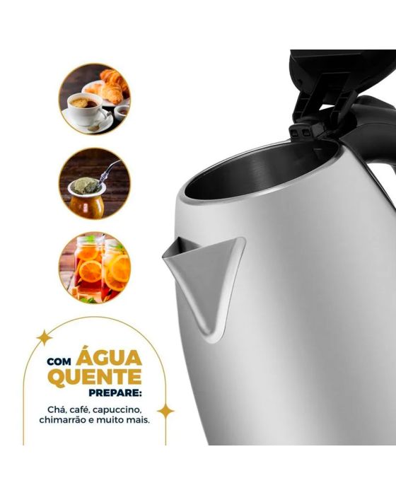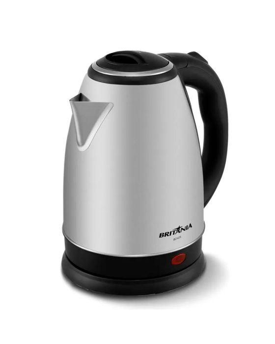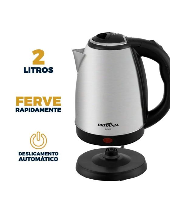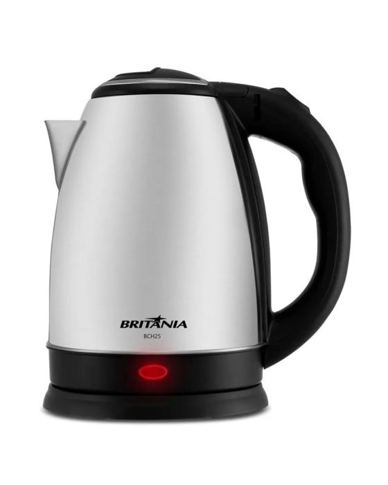Características:Não se preocupe em esquecer a jarra ligada! Quando conectada à Base 360°C, a Jarra Elétrica funciona em qualquer ângulo e aquece sua água até atingir fervura. Após isso, ela desliga automaticamente e torna seu uso mais prático, seguro e funcional no seu dia a dia. Além disso, é possível servir direto na mesa. Sim!A chaleira trás versatilidade para a cozinha e outros cômodos da copa, do escritório e demais ambientes corporativos compatíveis com o item, pois seu corpo é livre de fios, a base é destacável, facilitando o manuseio, armazenamento e transporte.A jarra em inox com capacidade para 2 litros, proporciona uma limpeza fácil, além de facilitar o alcance rápido de altas temperaturas da água, e garantir maior resistência a corrosão e atrito. O sistema de abertura da jarra, possui botão automático que facilita abertura e evita acidentes. Conte com os Eletroportáteis Britânia para trazer mais praticidade à sua rotina. Conte com a Chaleira Elétrica Britânia BCH25 2L Inox!Detalhes:- Marca: Britânia;- Modelo: BCH25;- Linha: Chaleiras elétricas;- Cor: Preto/Inox;- Tensão: 220V;- Potência: 1200W;- Capacidade: 2 Litros;- Contém: 1 unidade do produto;- Capacidade para 18 cafezinhos;- Pegador ergonômico;- Acabamento em aço inox;- Botão par abertura da tampa;- Ferve rapidamente;- Liga/desliga automático.Benefícios:- Capacidade para 2L: Jarra com capacidade para 2 litros, quantidade perfeita para a sua rotina;- Desligamento automático: Após iniciar a fervura, a chaleira desliga automaticamente. Mais segurança!- Jarra em Inox: Alta durabilidade e resistência, além de ser um toque diferenciado para a bancada da sua cozinha;- Base 360°: Você pode girar a jarra sobre a base em 360º, o que garante mais conforto durante o uso;- Jarra removível: Você pode servir a água diretamente nela, o que deixa tudo ainda mais prático;- Botão para abertura da tampa: Botão prático e seguro que facilita a abertura da tampa.Energia:- Tensão: 220V;- Potência: 1200W;- Consumo (kW/h): 1,2 kW/h;- Capacidade total e útil: 2L;- Tamanho do cordão: 0,7m;- Tomada: 10A (220V);- Pinos: 3 Pinos (220V).Composição:- Fabricado em plástico e metal.Medidas:- Dimensões do produto: 22 x 16 x 24,5cm (CxLxA);- Dimensões da embalagem: 20,2 x 17 x 23cm (CxLxA);- Peso do produto: 0,716kg;- Peso da embalagem: 0,844kg.Conteúdo da embalagem: 1 Chaleira Elétrica 2L BCH25 Inox 220V Britania e 1 Manual de Instruções.Garantia do fornecedor: 1 ano contra defeitos de fabricação.* As especificações podem ser alteradas sem aviso prévio ** Imagem meramente ilustrativa.