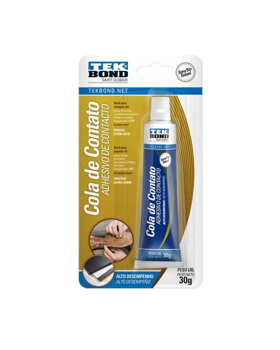 Caracteristicas:A Cola de Contato Tekbond® é um adesivo de contato, à base de borracha de Neoprene, desenvolvida para a colagem de vários tipos de materiais entre si (ex.: madeira/madeira, couro/couro) ou combinados (ex.: madeira/couro).Fácil de usar, oferece secagem rápida, boa resistência à água e excelente resistência logo de início.Modo de Usar:1. Certifique-se de que as superfícies a serem coladas estejam secas e limpas (livre de poeira, gordura ou qualquer resquício de oleosidade).2. Caso a superfície de colagem não seja porosa (lisa e brilhante), recomendamos que você lixe a peça para propiciar a penetração da cola.3. Aplique uma camada uniforme de cola em ambas as superfícies a serem coladas e aguarde de 5 a 10 minutos.4. Faça a união das peças, pressionando do centro para as pontas, evitando assim a formação de bolhas.5. Após o uso, feche bem a embalagem do produto para prolongar sua vida útil.Especificações Técnicas:- Aparência (visual): Líquido levemente amarelado com odor característico- Viscosidade a 25°C: 2.000 a 3.000- Teor de sólidos: 15 a 20%- Temperatura de aplicação: + 5 a 35°C- Temperatura de serviço: - 30 a 70°C- Tempo de cura inicial: 5 a 20 minutos- Tempo de cura total: 24 horas* As especificações podem ser alteradas sem aviso prévio ** Imagem meramente ilustrativa