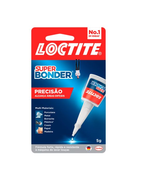 Caracteristicas:Loctite Super Bonder Precisão, é um adesivo instantâneo, monocomponente de média viscosidade de alta qualidade, para reparos precisos, alta performance, fácil de usar, transparente possui um bico extra longo projetado especificamente para aplicações que exijam precisão em áreas de difícil acesso, com força instantânea em uma única gota, usa a tecnologia de cianoacrilato que garante reparos invisíveis e duráveis. Adere rapidamente uma ampla variedade de materiais porosos e não poroso, como porcelana, metal, borracha, papel, madeira, cerâmica, plástico**, etc Design funcional, projetado para aplicações rápidas, variadas e pontuais. Super Bonder Precisão é resistente à umidade, como também ao choque e à temperatura, isso a torna excelente para aplicações em vasta gama de superfícies, transparente com adesão instantânea, tampa ante entupimento, Super Bonder Precisão embalagem com 5g. - Resistente à altas temperaturas, à umidade e a impactos - Forças instantâneas- Alta performance - Bico ante anti-entupimento e bico de longo alcance. - Embalagem prática que fica em pé Adere rapidamente uma ampla variedade de materiais porosos e não porosos como: porcelana, madeira, papel, couro, plástico**, cerâmica etc. OBS.: Não adere **plásticos à base de Polietileno, Polipropileno, PTFE (resina antiaderente), silicone e Isopor (marca KNAUF Isopor ltda)* As especificações podem ser alteradas sem aviso prévio ** Imagem meramente ilustrativa