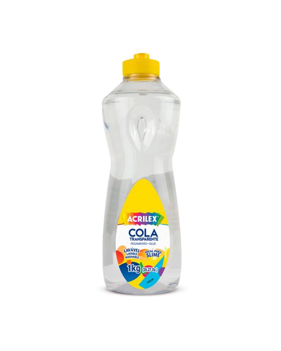 Caracteristicas:A cola transparente Acrilex é muito útil para trabalhos escolares ou profissionais. Sem pigmentação, não deixará manchas nos papéis. Perfeita para diversas finalidades desde trabalhos escolares até artesanatos.Detalhes:- Marca: Acrilex.- Referência: 19901.- Linha: Cola.- Cor: Transparente.- Contém: 1 unidade do produto.- Volume/Peso: 1kg.- Possui bico aplicador que facilita a aplicação- Ideal para fazer slimes.- Lavável.- Não tóxica.- À base de água. Aplicação:- Para colagens de papel, papel cartão e cartolina.Para fazer slime: - Despeje a cola em um recipiente e adicione água boricada e bicabornato de sódio. Misture bem até chegar no ponto desejado e pronto.Conservação:- Conserve em lugares frescos e seco.- Depois do uso, mantenha a tampa fechada.* As especificações podem ser alteradas sem aviso prévio ** Imagem meramente ilustrativa.