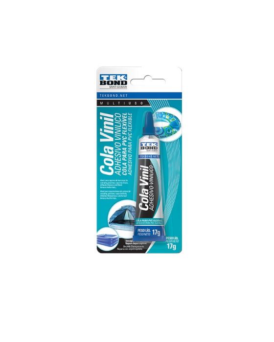 Características:A Cola Vinil Tekbond é um produto especialmente desenvolvido e indicado para colagens de PVC flexível entre si. Ideal para reparos de barracas de camping, lonas de caminhão, boias infláveis, piscinas, malas, dentre outros.Possui rápida aderência, boa flexibilidade e excelente resistência água e intempéries.Modo de Usar:A aplicação ideal deve ser feita em um ambiente com temperatura entre 5ºC a 35°C.1.Certifique-se de que as superfícies a serem coladas estão limpas, secas e livres de toda poeira, sujeira e qualquer outro contaminante2.Aplique o produto em ambas as superfícies3.Pressione o material forte e uniformemente4.A secagem inicial ocorre entre 10 a 20 minutos. Cura total em 24 horas.Especificações Técnicas:- Viscosidade (cP): 2000 a 2400- Temperatura de Trabalho (ºC): -30 a 85- Teor de sólidos: 20%- Cura inicial: 10 a 20 minutos- Cura total: 24 horas* As especificações podem ser alteradas sem aviso prévio ** Imagem meramente ilustrativa
