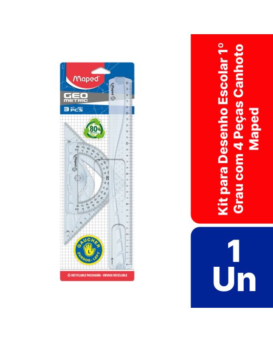 Características:Com o Kit Geométrico Para Canhotos da Maped, você tem a certeza de que cada ferramenta foi cuidadosamente projetada para atender às necessidades específicas dos canhotos, tornando as atividades de medição e desenho mais confortáveis e eficientes.Todos os itens são feitos de material durável e de alta qualidade, garantindo longevidade e resistência. O kit é embalado em um blister prático, proporcionando proteção e organização, além de facilitar o armazenamento e o transporte.Detalhes:- Marca: Maped;- Modelo: Geo Metric;- Referência: 89711801;- Linha: Kit Geométrico;- Cores: Transparente;- Contém: 1 embalagem com 3 peças;- Para canhotos;- 80% Reciclado;- Projetado para oferecer conforto e precisão.Fabricado na China | Validade: Indeterminada.Este conjunto inclui:- 1 Régua de 30cm: Desenvolvida com marcações invertidas para facilitar a leitura e a medição por canhotos, garantindo precisão em todas as suas atividades escolares e profissionais;- 1 Esquadro de 45°: Projetado ergonomicamente para proporcionar facilidade no traçado de linhas e ângulos, com marcações claras e voltadas para o uso canhoto;- 1 Transferidor de 180°: Possui marcações especialmente posicionadas para serem lidas facilmente por canhotos, permitindo medições de ângulos com alta precisão e sem dificuldades.Composição:- Fabricado em Polipropileno e Poliestireno.Medidas:- Dimensões da embalagem: 36,4 x 12,4 x 1cm (CxLxA);- Peso: 50g.ATENÇÃO! NÃO RECOMENDÁVEL PARA CRIANÇAS DE ATÉ 4 (QUATRO) ANOS POR CONTER PARTE(S) PEQUENA(S) QUE PODEM SER ENGOLIDA(S) OU ASPIRADA(S). CRIANÇAS DE ATÉ 8 ANOS DEVEM UTILIZAR SOB SUPERVISÃO DE UM ADULTO POR CONTER PONTA(S) AGUDA(S) FUNCIONAL(IS).* As especificações podem ser alteradas sem aviso prévio ** Imagem meramente ilustrativa.