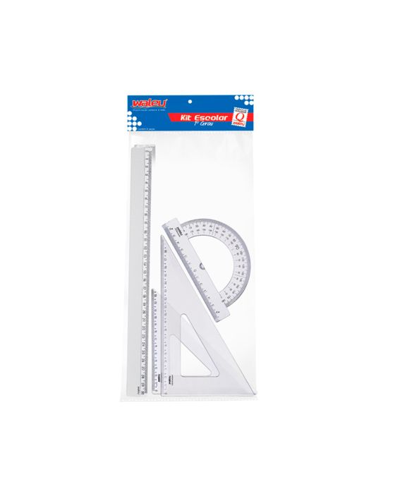 Caracteristicas:Conteúdo - 01 régua 30cm, - 01 esquadro 21x45, - 01 esquadro 21x60, - 01 transferidor 180ºMedidas - Altura: 2mm - Largura: 132mm - Comprimento: 360mm Conteúdo - 01 régua 30cm, - 01 esquadro 21x45, - 01 esquadro 21x60, - 01 transferidor 180º - Fabricante: Waleu - Peso: 100 Gr - Garantia de 7 dias pela loja e 90 pelo fabricante - Confeccionado em Plástico Poliestireno - Cor: Cristal * As especificações podem ser alteradas sem aviso prévio ** Imagem meramente ilustrativa