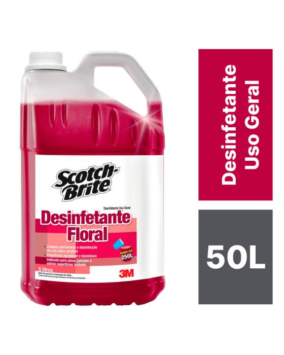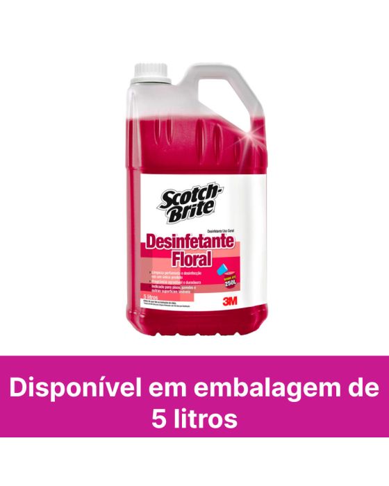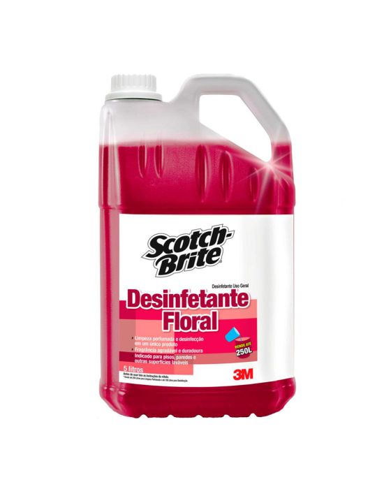 Características:O Desinfetante de Uso Geral Scotch-Brite™ Floral oferece limpeza perfumada e desinfecção em um único produto. É indicado para superfícies fixas como pisos, paredes, mobiliário, louças sanitárias, azulejos, cerâmicas, metais, porcelanatos, etc.Com eficácia comprovada, o Desinfetante de Uso Geral Scotch-Brite™ Floral possui fórmula à base de quaternário de amônio, testada contra as bactérias Salmonella choleraesuis, Staphylococcus aureus e Pseudomonas aeruginosa. Ele é prático, pois não necessita de enxágue, e tem fragrância floral agradável e duradoura.Detalhes:- Marca: Scotch-Brite™;- Fabricante: 3M;- Modelo: Desinfetante de Uso Geral;- Linha: Desinfetante;- Fragrância: Floral;- Volume/Peso: 5 Litros;- Contém: 1 unidade do produto de 5 Litros;- Versatilidade: limpeza perfumada e desinfecção em um único produto;- Praticidade: não necessita de enxágue;- Fragrância agradável e duradoura;- Diluições: limpeza perfumada – diluição 1L para 50L; limpeza e desinfecção – diluição 1L para 20L;- Rendimento total da bombona: até 250L.Aplicações Sugeridas:- Produto utilizado na limpeza e desinfecção de pisos e superfícies.Indicado para:- Indicado para limpeza perfumada e desinfecção de superfícies como pisos, paredes, mobiliário, louças sanitárias, azulejos, cerâmicas, metais, porcelanatos, etc.Eficácia:- fórmula à base de quaternário de amônio, testada contra as bactérias Salmonella choleraesuis, Staphylococcus aureus e Pseudomonas aeruginosa.Diluição:- Limpeza perfumada – diluição 1L para 50L; - Limpeza e desinfecção – diluição 1L para 20L;- Rendimento total da bombona: até 250L.Composição:- Água, Compostos de amônia quaternária, benzil-C12-18-alquildimetil, Cloretos, Álcool Etílico, Surfactante Não Iônico.Conservação e Armazenamento:- Armazene em local bem ventilado;- Mantenha em local fresco;- Armazene afastado de ácidos;- Armazene afastado de materiais oxidantes.ATENÇÃO! CONSERVE FORA DO ALCANCE DE CRIANÇAS E DOS ANIMAIS DOMÉSTICOS!* As especificações podem ser alteradas sem aviso prévio ** Imagem meramente ilustrativa.