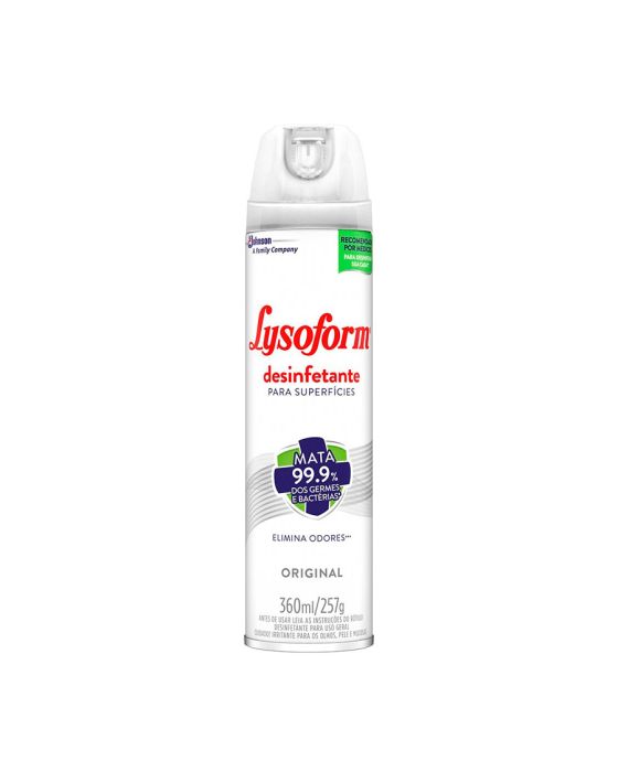 CaracterísticasLysoform Desinfetante Aerossol mata 99,9% dos germes, bactérias, fungos e elimina odores, sendo a solução mais prática para desinfetar superfícies como sofás, cortinas, sapatos, roupas e armários. Mata o vírus H1N1.- Contém 360ml/274g- Fragrância: OriginalInstruções de uso: Agite antes de usar. Segure a embalagem na posição vertical e aplique diretamente sobre as superfícies a serem desinfetadas ou desodorizadas a uma distância de 15 a 20cm. Deixe agir por 10 minutos. Não é necessário usar em excesso. Usar luvas para sua aplicação.Como acionar a trava1. Pressione a parte superior para travar (Close/Cerrar - Fechado).2. Pressione a parte inferior para destravar (Open/Abrir - Aberto).Composição: Ativo, Veículo, Solvente, Propelentes, Fragrância e Inibidores de corrosão.Componente ativo: Ortofenilfenol 0,1%.* As especificações podem ser alteradas sem aviso prévio ** Imagem meramente ilustrativa