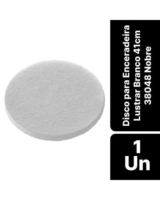 Características:Já pensou em lustrar os seu piso e deixar ele impecável? Com o Disco para enceradeira Lustrar Nobre, você poderá fazer a limpeza dos ambientes e deixar como novo!o Disco irá retirar a camada de sujeira e ao final do processo, a superfície estará pronta para reaplicação de acabamento com cera.Detalhes:- Marca: Nobre;- Referência: 38048;- Linha: Fibras para enceradeiras;- Tipo: Lustrar;- Cor: Branco;- Tamanho: 41cm;- Contém: 1 unidade do produto.Onde utilizar:- Utilização em enceradeiras de baixa rotação.Compatibilidade:- Compatível com enceradeiras de 410mm (41cm).Composição:- Fabricado com fibras sintéticas abrasivo.Medidas:- Dimensões do produto: 41 x 41 x 2cm (CxLxA);- Peso: 226g.* As especificações podem ser alteradas sem aviso prévio ** Imagem meramente ilustrativa.
