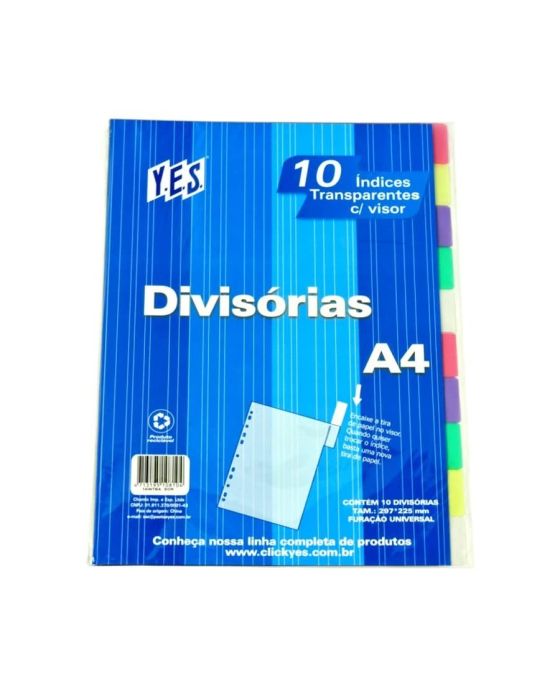 Ideal para organizar e identificar matérias escolares, documentos em fichários e pastas. Feito de polipropileno de alta qualidade, totalmente reciclável e durável - Folha Cristal e Identificador Colorido/SortidoCaracteristicas: - Possuí 10 Divisórias com visor - Acompanha etiquetas de identificação. - Tamanho: A4 - Medidas do produto: 230x295mm. - Dimensões embalagem:(L x A x P) 225 x 297 x 0,5cm - Feito com polipropileno de alta resistência e transparência - Marca: Yes / Fabricante: Chamix - Furação universal - Serve para todos os tipos de arquivos com ferragem de 2, 3 e 4 argolas - Produto 100% reciclável - Não adere ao impresso - Referência: 10INTBA - transparente, sortida - Acompanha índices coloridos personalizáveis para identificação - Peso: 80,0 g * As especificações podem ser alteradas sem aviso prévio ** Imagem meramente ilustrativa