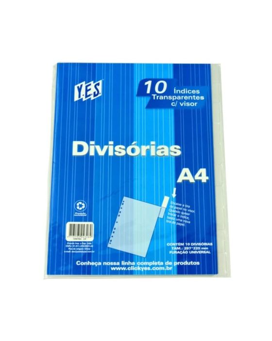 Ideal para organizar e identificar matérias escolares, documentos em fichários e pastas. Feito de polipropileno de alta qualidade, totalmente reciclável e durável - Todo Cristal / Folha e IdentificadorCaracteristicas: - Possuí 10 Divisórias com visor para pastas Fichário - Acompanha etiquetas de identificação. - Tamanho: A4 - Medidas do produto: 230x295mm. - Dimensões embalagem:(L x A x P) 225 x 297 x 0,5cm - Feito com polipropileno de alta resistência e transparência - Marca: Yes / Fabricante: Chamix - Furação universal - Serve para todos os tipos de arquivos com ferragem de 2, 3 e 4 argolas - Produto 100% reciclável - Não adere ao impresso - Referência: 10INTBA - colorido, sortida - Acompanha índices coloridos personalizáveis para identificação - Peso: 80,0 g * As especificações podem ser alteradas sem aviso prévio ** Imagem meramente ilustrativa