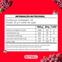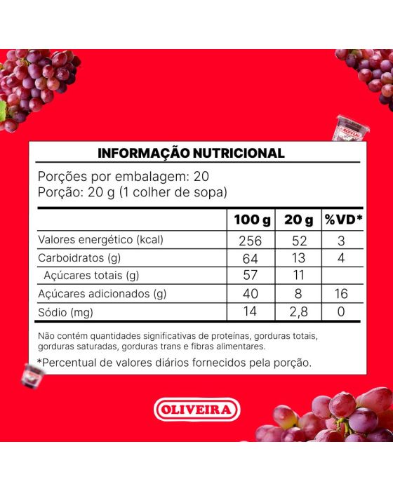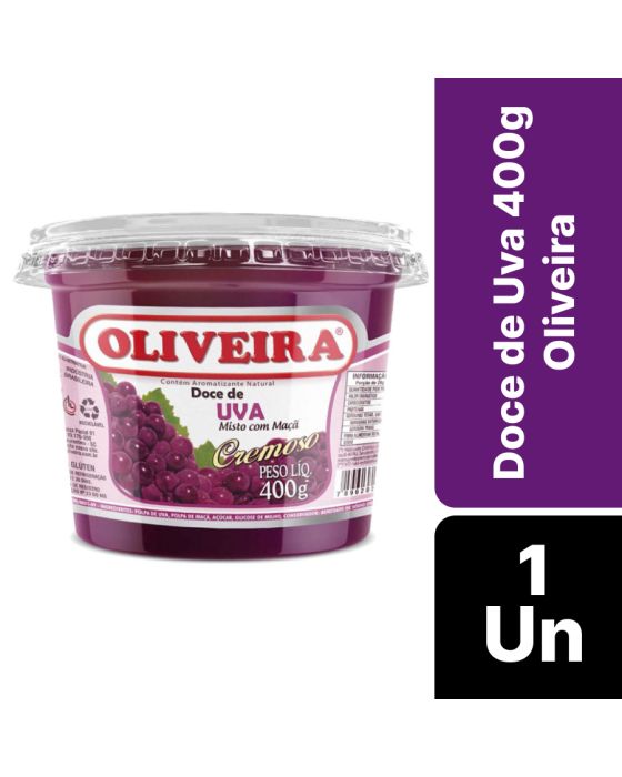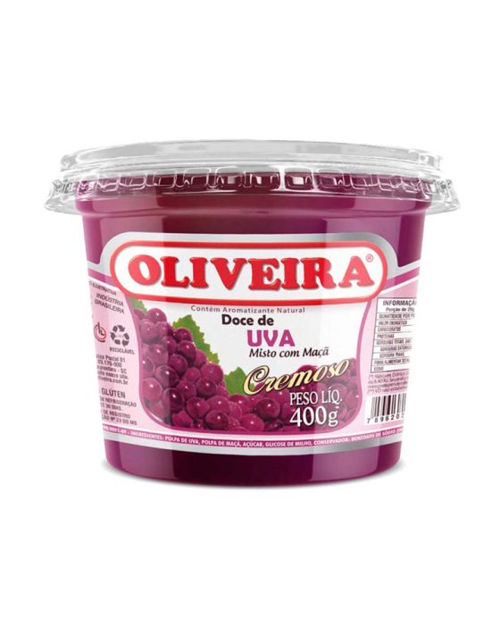 Características:O Café da manhã ou da trade, ou até mesmo aquele lanche no intervalo do trabalho ficará ainda mais saboroso com o Doce de Uva Oliveira, desfrute do sabor púnico e marcante, feito com frutas frescas e selecionadas, que proporcionam uma experiência de sabor autêntica e memorável.Detalhes:- Marca: Oliveira;- Linha: Doces;- Tipo: Pote;- Sabor: Uva;- Peso: 400g;- Contém:- Tradição regional;- Frutas selecionadas;- Menos açúcar, mais sabor;- Misto com maça.Indústria Brasileira. | Validade: 12 meses após a data de fabricação impressa na embalagem;Ideal para:- Ideal para refeitórios, copas, e ambientes corporativos que servem café da manhã, café da tarde e lanche aos colaboradores, além de ser um item para cestas presenteáveis.Ingredientes:- Polpa de uva, Polpa de maça, Açúcar, Glicose de milho geneticamente modificado (espécies doadoras: Agrobacterium tumefaciens, Bacillus thuringiensis, Sphingobium herbicidoravans, Streptpmyces viridochromogenes e Zea mays), conservador INS 211, Acidulante INS 338 e Aromatizante natural de uva.Conservação:- Manter em local seco, arejado e inodoro;- Após aberto, manter sob refrigeração e consumir em até 30 dias.Medidas:- Dimensões do produto: 10,5 x 10,5 x 8,2cm (CxLxA);- Peso: 400g.ALÉRGICOS: NÃO CONTÉM GLÚTEN.* As especificações podem ser alteradas sem aviso prévio ** Imagem meramente ilustrativa.