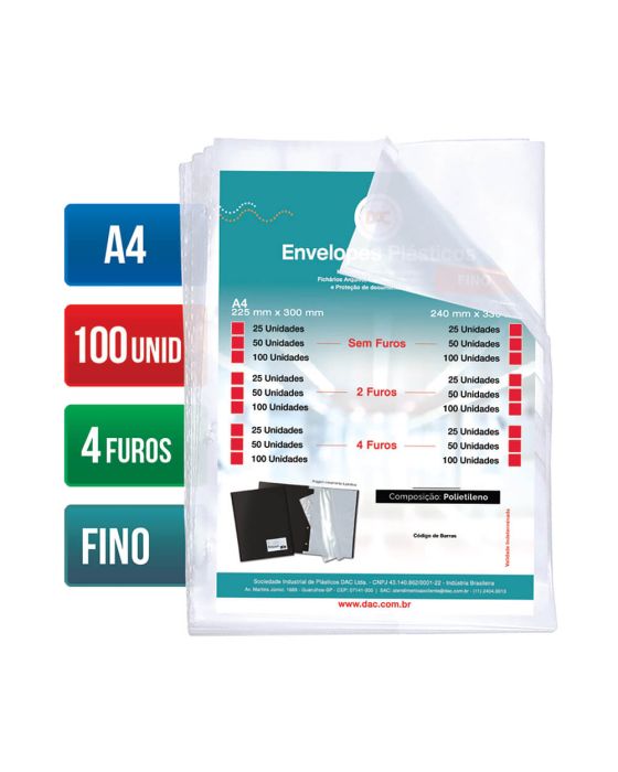 Caracteristicas:- Envelope plástico- Fino- 4 Furos - 006 micras- Tamanho A4: 225mm x 300mm * As especificações podem ser alteradas sem aviso prévio ** Imagem meramente ilustrativa.
