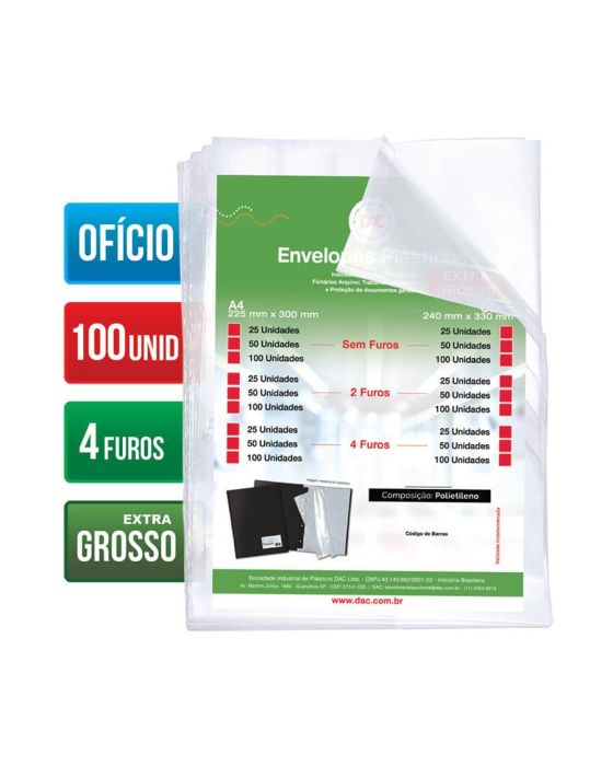 Envelope Plastico Oficio Extra Grosso C/4 Furos 20 Micras C/100 Ref 5088 Dac