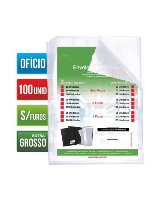 Envelope Plastico Oficio Extra Grosso S/ Furo 20 Micras C/100 Ref 5087 Dac
