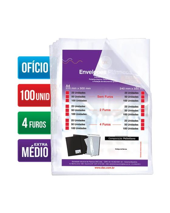 Envelope Plastico Oficio Extra Medio C/4 Furos 12 Micras C/100 Ref 5178 Dac