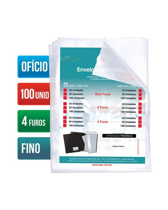 Caracteristicas:- Envelope plástico- Fino- 4 Furos - 006 micras- Tamanho Oficio: 240 x 330mm * As especificações podem ser alteradas sem aviso prévio ** Imagem meramente ilustrativa.