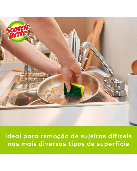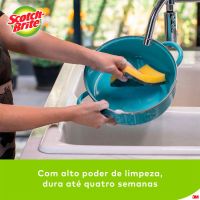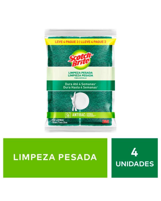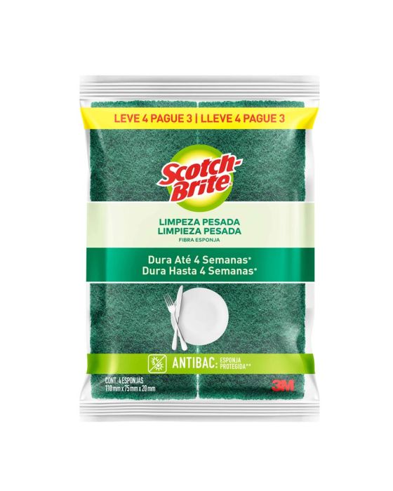 Características:A líder de vendas no Brasil*. A Esponja Multiuso Scotch-Brite® é a solução ideal para remoção de sujeiras difíceis nos mais diversos tipos de superfície. Com alto poder de limpeza, ela dura até quatro semanas e é ótima para uso na cozinha, em garagens e em ambientes externos. A escolha número um entre os consumidores. Esta esponja para limpeza dupla face (verde a amarela) é ótima para lavar copos, pratos, talheres e utensílios em geral. Ela garante alta performance, máxima limpeza e longa duração – pode ser utilizada por até quatro semanas sem perder a qualidade.Detalhes:- Marca: Scotch-Brite®;- Fabricante: 3M®;- Modelo: Esponja de Limpeza Pesada Scotch-Brite®;- Referência: HB004647721;- Linha: Esponjas;- Cor: Verde/Amarela;- Uso: Cozinha;- Contém: 1 embalagem do produto com 4 unidade;- Embalagem promocional;- Escolha número um entre os consumidores;- Com alto poder de limpeza, dura até quatro semanas**;- Esponja de lavar louça com alta performance, máxima limpeza e longa duração**;- Pode ser higienizada em micro-ondas ou com água fervente**.Ideal para:- Ideal para: lavar copos, pratos, talheres e utensílios em geral.Aplicações sugeridas:- Ideal para remoção de sujeiras difíceis nos mais diversos tipos de superfície.Medidas:- Composição: 11 x 2 x 7,5cm (CxExL).Conteúdo da embalagem: 1 Esponja Multiuso Limpeza Pesada Scotch Brite 3m.** Durabilidade de cada esponja, segundo a pesquisa com consumidores em condições normais de uso nas cidades de São Paulo, Recife, Porto Alegre e Rio de Janeiro.* As especificações podem ser alteradas sem aviso prévio ** Imagem meramente ilustrativa.
