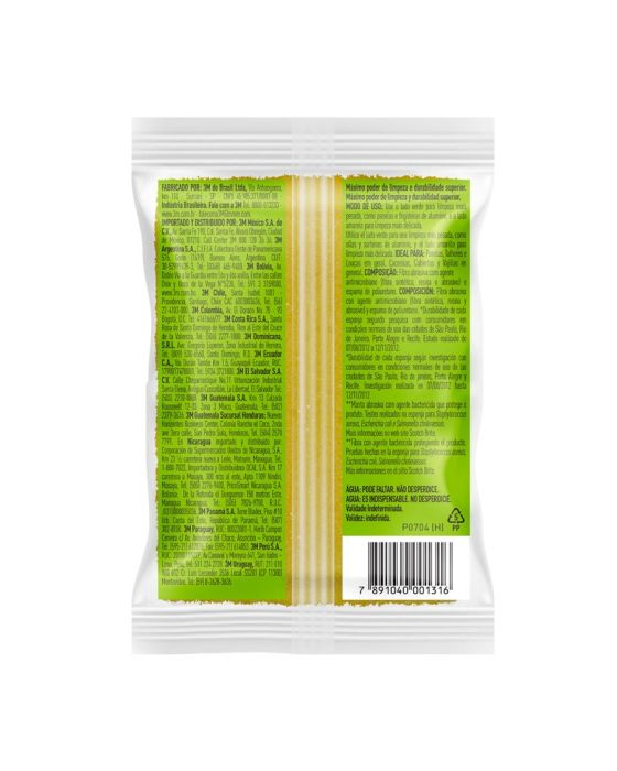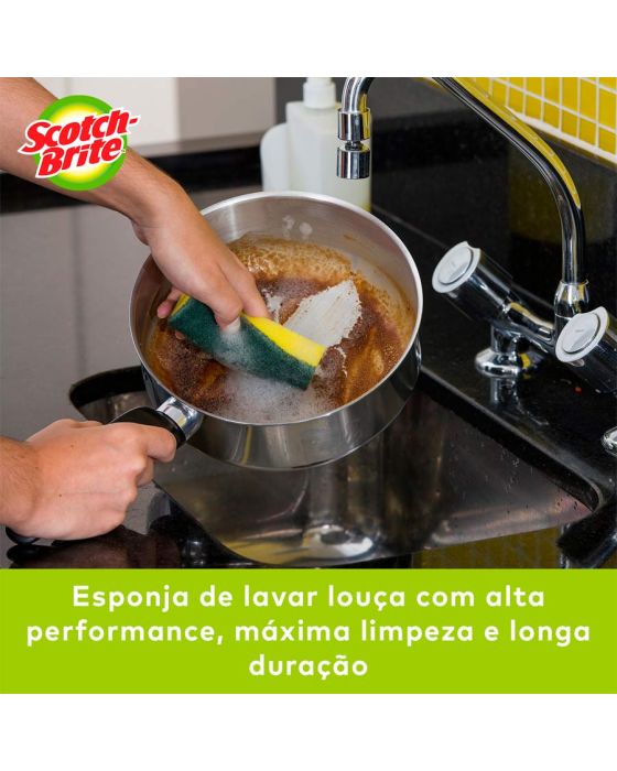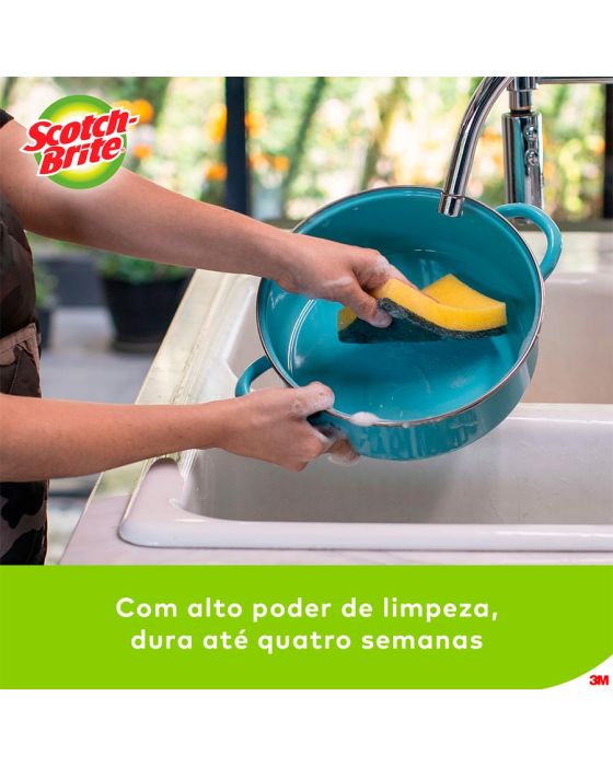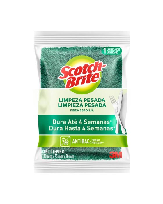 Características:A líder de vendas no Brasil*. A Esponja Multiuso Scotch-Brite® é a solução ideal para remoção de sujeiras difíceis nos mais diversos tipos de superfície. Com alto poder de limpeza, ela dura até quatro semanas e é ótima para uso na cozinha, em garagens e em ambientes externos. A escolha número um entre os consumidores. Esta esponja para limpeza dupla face (verde a amarela) é ótima para lavar copos, pratos, talheres e utensílios em geral. Ela garante alta performance, máxima limpeza e longa duração – pode ser utilizada por até quatro semanas sem perder a qualidade.Detalhes:- Marca: Scotch-Brite®;- Fabricante: 3M®;- Modelo: Esponja de Limpeza Pesada Scotch-Brite®;- Referência: H0001372780;- Linha: Esponjas;- Cor: Verde/Amarela;- Uso: Cozinha;- Contém: 1 embalagem do produto com 1 unidade;- Escolha número um entre os consumidores*;- Com alto poder de limpeza, dura até quatro semanas**;- Esponja de lavar louça com alta performance, máxima limpeza e longa duração**;- Pode ser higienizada em micro-ondas ou com água fervente**.Ideal para:- Ideal para: lavar copos, pratos, talheres e utensílios em geral.Aplicações sugeridas:- Ideal para remoção de sujeiras difíceis nos mais diversos tipos de superfície.Medidas:- Composição: 11 x 2 x 7,5cm (CxExL).Conteúdo da embalagem: 1 Esponja Multiuso Limpeza Pesada Scotch Brite 3m.** Durabilidade de cada esponja, segundo a pesquisa com consumidores em condições normais de uso nas cidades de São Paulo, Recife, Porto Alegre e Rio de Janeiro.*** Informações de acordo com testes realizados em laboratório externo no período de 10/05/19 a 19/05/19.* As especificações podem ser alteradas sem aviso prévio ** Imagem meramente ilustrativa.