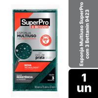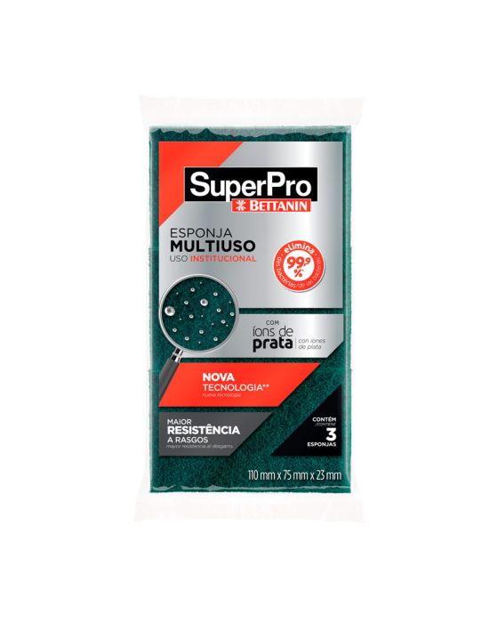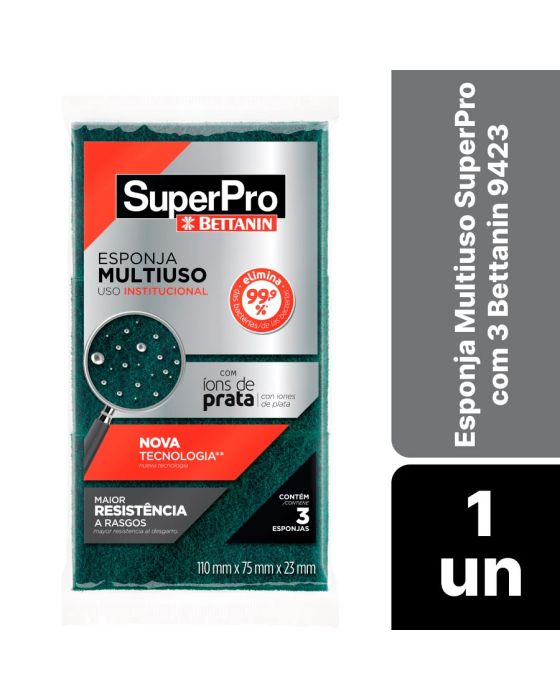 Características:Com a Esponja Multiuso SuperPro Bettanin, você poderá limpar diversos tipos de superfícies sem riscar os utensílios, possui agentes antimicrobiano com capacidade para reduzir 99,9% das bactérias Staphylococcus aureus e Escherichia coli.Conta com uma nova tecnologia no processo de produção, atribuindo maior resistência ao produto contra rasgos durante o seu uso!Detalhes:- Marca: SuperPro;- Fabricante: Bettanin;- Modelo: Esponja Multiuso;- Referência: 9423;- Linha: Esponjas;- Cor: Amarelo/Verde;- Contém: 1 embalagem com 3 unidades do produto;- Elimina 99,9% das bactérias;- Com Íons de prata;- Nova tecnologia;- Maior resistência a rasgos.Validade Indeterminada | Produto não perecível.Ideal para: - Indicada para uso geral;- Limpeza de louças e panelas antiaderentes e utensílios com superfícies delicadas.Modo de usar:- Utilize a esponja para a limpeza de louças e panelas.Precauções:- Usar com água, detergente ou sabão e não utilizar com produtos de limpeza à base de álcool;- Testar uma pequena área antes de utilizar para prevenir possíveis riscos;- Esta esponja não é recomendada na utilização em superfícies de inox ou pintadas.Composição:- Espuma de poliuretano, agente bactericida, fibra sintética e abrasivo.Medidas: - Dimensões do produto: 11 x 7,5 x 2,6cm (CxLxA);- Dimensões da embalagem: 29 x 11 x 2,6cm (CxLxA);- Peso: 2,010g.* As especificações podem ser alteradas sem aviso prévio ** Imagem meramente ilustrativa.