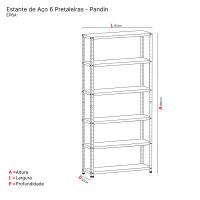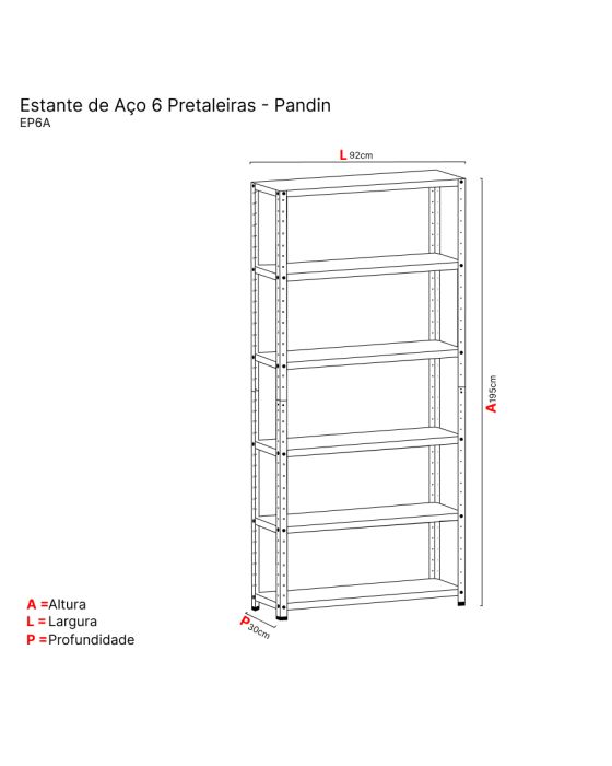 Características:Praticidade e versatilidade são as palavras chaves que definem esses móveis tão funcional, além de duráveis e resistentes, possui o melhor custo benefício. A funcionalidade das estantes de aço vai muito álem do ambiente de escritório ou área de serviço. Elas funcionam muito bem como divisor de ambientes, e ficam lindas quando você compõe com itens decorativos e plantas.Detalhes:- Marca: Pandin.- Modelo: EP6AVU.- Linha: Estante de Aço.- Cor: Cinza.- Prateleira: 6 Prateleiras.- Material: Aço.- Volume: Único.- Acompanha 40 parafusos com porcas sextavadas zincados de ¼ x ½ e 4 sapatas plásticas.- 35 opções de regulagens de altura, dobras duplas nas laterais e triplas nas partes frontais e posteriores.- Sistema prático de encaixe.- Mais facilidade de montagem.- Patente de inovação, com design estrutural exclusivo.Onde usar:- Escritórios: Organização de materiais de escritório, livros, pastas e documentos.- Área de serviço: Organização de materiais de limpeza, toalhas, tapetes e etc.- Dispensa: Organização de alimentos e utensílios domésticos.Medidas:- Largura: 92cm.- Altura: 195cm.- Profundidade: 30cm.Acabamento:- Tratado pelo processo anti-corrosivo à base de fosfato de zinco e pintura eletrostática a pó com camada de 30 a 40 mícrons com secagem em estufa a 240 ºC (na cor cinza cristal).Estrutura:- Coluna: 08 colunas bipartidas com fixação através de encaixe, confeccionadas em chapa nº 24 (0,6cm), sendo 4 unidades inferiores com 100cm de altura e 4 superiores com 100cm de altura, dobra perfilada em L de 3,5 x 3,5cm com conformação na parte central e bordas conformadas e rebatidas com 35 furos circulares para regulagem de altura com travamento eficaz das bandejas- Prateleira: Confeccionada em chapa nº 26 (0,045cm) com dobras duplas e rebatidas nas laterais (4 dobras perpendiculares sendo a 1ª 1,2cm rebatida, a 2ª a 3cm com 90°, a 3ª a 91,5cm com 90°, a 4ª a 3cm com 90º e termina com 1,2cm), e triplas nas partes frontais e posteriores (6 dobras perpendiculares sendo 1ª a 1cm com 90º, a 2ª a 1cm com 90º, a 3ª a 3cm com 90º, a 4ª a 30cm com 90º, a 5ª a 3cm a 90º e a 6ª com 1cm com 90º e termina com 1cm).Capacidade:- Capacidade de peso sem reforço: Suporta até 20kg por prateleira distribuidos de maneira uniforme.*Produto enviado desmontado.Obs: A montagem das prateleiras deverá iniciar sempre no terceiro furo livre de baixo para cima.* As especificações podem ser alteradas sem aviso prévio ** Imagem meramente ilustrativa.