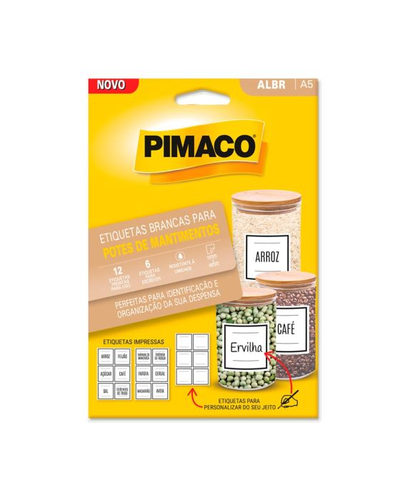 Características:Bateu aquela vontade de cozinhar algo diferente, mas sua cozinha está desorganizada?A Pimaco te ajuda a organizá-la: chegaram as novas etiquetas para potes de mantimentos! São 12 etiquetas prontas para uso e mais 6 etiquetas para personalizar como quiser! Além disso, elas são resistentes à umidade, para garantir que a identificação dure por muito tempo no pote em sua dispensa.- 12 etiquetas prontas para uso, sendo elas de arroz, feijão, açúcar, café, sal, farinha de trigo, farinha de mandioca, farinha de rosca, farofa, cereal, macarrão e aveia.- 6 etiquetas para personalizar do seu jeito- Resistente à umidade- Dimensões: 70 x 68mm- Composição: filme de polipropileno biorientado branco com adesivo acrílico.* As especificações podem ser alteradas sem aviso prévio ** Imagem meramente ilustrativa.
