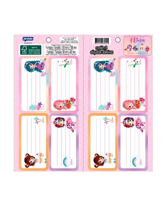 Características:Identificar os materiais escolares dos seus filhos ficará ainda mais fácil com a Etiqueta Escolar Nina Jandaia, são 4 personagens fofinhas que vão acompanhar no dia a dia escolar!Detalhes:- Marca: Jandaia;- Modelo: Nina;- Linha: Etiquetas escolares;- Cor: Rosa, Pink, Laranja e Roxo;- Quantidade: 8 unidades;- Contém: 1 embalagem com 8 unidades;- Formato: 100 x 198mm (10 x 19,8cm)- Gramatura: 190 g/m2;- 4 linhas paras escrita;- Produto certificado: FSC.Indústria Brasileira. | Validade: Indeterminada.Composição:- Fabricado em papel adesivo 190 g/m2.Medidas:- Dimensões do produto: 20,1 x 10 x 0,1cm (CxLxA);- Peso: 0,6g* As especificações podem ser alteradas sem aviso prévio ** Imagem meramente ilustrativa.