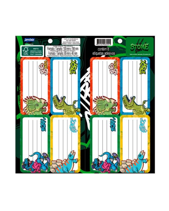Características:Identificar os materiais escolares dos seus filhos ficará ainda mais fácil com a Etiqueta Escolar Stone Jandaia, são 4 dinossauros fofos que vão acompanhar no dia a dia escolar!Detalhes:- Marca: Jandaia;- Modelo: Stone;- Linha: Etiquetas escolares;- Cor: Vermelho, Azul, Verde e Amarelo;- Quantidade: 8 unidades;- Contém: 1 embalagem com 8 unidades;- Formato: 100 x 198mm (10 x 19,8cm)- Gramatura: 190 g/m2;- 4 linhas paras escrita;- Produto certificado: FSC.Indústria Brasileira. | Validade: Indeterminada.Composição:- Fabricado em papel adesivo 190 g/m2.Medidas:- Dimensões do produto: 20,1 x 10 x 0,1cm (CxLxA);- Peso: 0,6g* As especificações podem ser alteradas sem aviso prévio ** Imagem meramente ilustrativa.