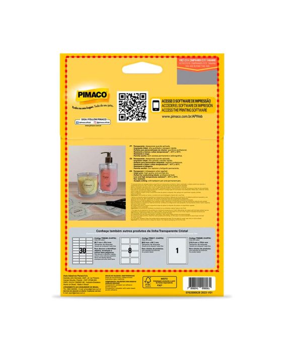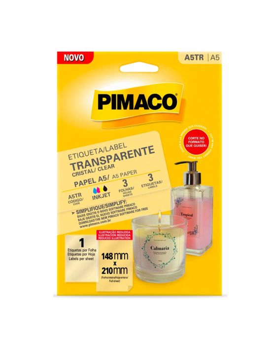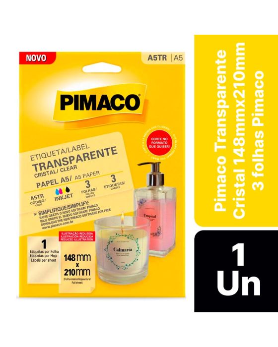 Características:As etiquetas transparentes da Pimaco chegaram para revolucionar o modo de etiquetar seus itens. As Etiquetas transparentes possuem alta qualidade para impressão inkjet ou escrita, são resistentes a rasgos, suportam ampla faixa de temperaturas (-40°C a 90°C). Configure o modo fotográfico na sua impressora para obter um resultado perfeito.Detalhes:- Marca: Pimaco;- Modelo: Pimaco Transparente Cristal;- Referência: A5TR;- Linha: Etiquetas adesivas;- Cor: Transparente;- Formato: Retangular;- Tamanho: 148 x 210mm (14,8 x 21cm);- Quantidade de etiquetas: 3 etiquetas;- Quantidade de etiquetas por folhas: 1 etiqueta;- Quantidade de folhas: 3 folhas;- Contém: 1 unidade do produto;- Resistente a baixas e altas temperaturas: -40°C a 90°C;- Perfeita para a personalização de rótulos: aparência profissional;- Impressão Inkjet: Alta qualidade e secagem rápida;- Resistente a rasgos;- Qualidade impressão Inkjet ou escrita.Indústria Brasileira | Validade indeterminada.Composição:- Fabricado em Poliéster com Adesivo Acrílico Aquoso.Medidas:- Tamanho: 148 x 210mm (14,8 x 21cm).*As especificações podem ser alteradas sem aviso prévio ** Imagem meramente ilustrativa.