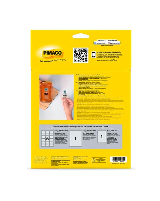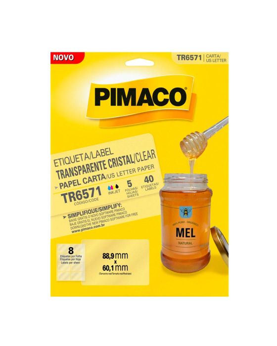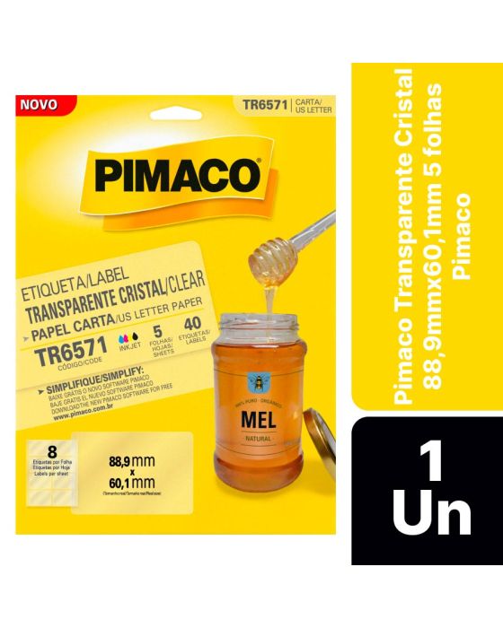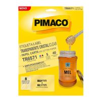 Características:As etiquetas transparentes da Pimaco chegaram para revolucionar o modo de etiquetar seus itens. As Etiquetas transparentes possuem alta qualidade para impressão inkjet ou escrita, são resistentes a rasgos, suportam ampla faixa de temperaturas (-40°C a 90°C). Configure o modo fotográfico na sua impressora para obter um resultado perfeito.Detalhes:- Marca: Pimaco;- Modelo: Pimaco Transparente Cristal;- Referência: TR6571;- Linha: Etiquetas adesivas;- Cor: Transparente;- Formato: Retangular;- Tamanho: 88,9 x 60,1mm;- Quantidade de etiquetas: 40 etiquetas;- Quantidade de etiquetas por folhas: 8 etiquetas;- Quantidade de folhas: 5 folhas;- Contém: 1 unidade do produto;- Resistente a baixas e altas temperaturas: -40°C a 90°C;- Perfeita para a personalização de rótulos: aparência profissional;- Impressão Inkjet: Alta qualidade e secagem rápida;- Resistente a rasgos;- Qualidade impressão Inkjet ou escrita.Indústria Brasileira | Validade indeterminada.Composição:- Fabricado em Poliéster com Adesivo Acrílico Aquoso.*As especificações podem ser alteradas sem aviso prévio ** Imagem meramente ilustrativa.