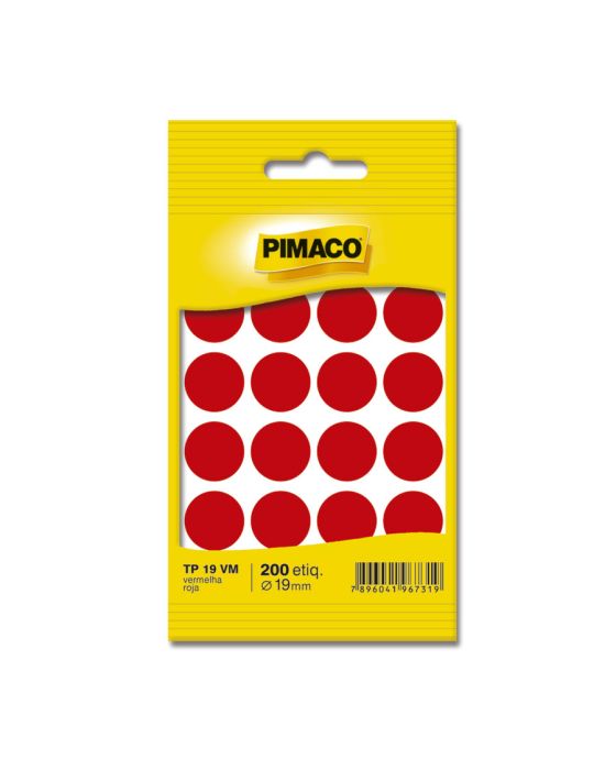 Caracteristicas:As etiquetas PIMACO podem ser amplamente utilizadas no trabalho ou em casa, sempre mantendo um alto nível de apresentação. São diversos e modelos e quantidades para suprir qualquer demanda.Detalhes:- Marca: Pimaco.- Modelo: TP-19 VM.- Linha: Etiquetas.- Formato: Redondo.- Cor: Vermelho.- Quantidade total de etiquetas: 200 etiquetas.- Quantidade por folha: 20 etiquetas.- Quantidade de folhas: 10 folhas.- Carreira: 4 fileiras com 5 etiquetas.- Tamanho da etiqueta: Ø19mm.Onde usar:- Ideal para organização de produtos, catálogos, índices, lacrar envelopes e etc.Composição:- Papel ou película de plástico transparente com adesivo acrílico aquoso.Validade Indeterminada.* As especificações podem ser alteradas sem aviso prévio ** Imagem meramente ilustrativa.