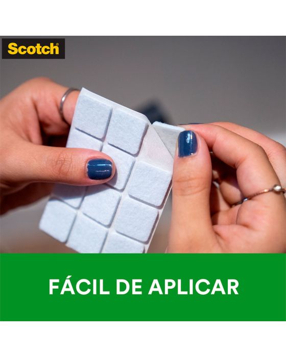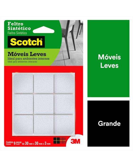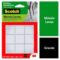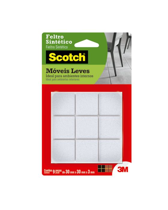 Características:O Feltro Sintético para Móveis Leves 3M Scotch™ ajuda você a proteger a beleza do seu piso. Equipados com adesivo poderoso e feltro durável, os protetores de piso aderem sem esforço aos pés dos seus móveis e fornecem proteção duradoura contra riscos e arranhões.Detalhes:- Marca: Scotch™;- Fabricante: 3M™;- Referência: HB004262588;- Cor: Branco;- Tamanho: Grande;- Formato: Quadrado;- Contém: 1 embalagem do produto com 9 unidades;- Não Risca: Protege e não danifica o piso;- Resistente: Durável;- Ambiente: Interno;- Medida: 3 cm x 3cm.Aplicação:- É ideal para aplicar em móveis, como: Mesas, Cadeiras, Banquetas e Pufes.Modo de uso: - As superfícies devem estar limpas, secas e livres de gorduras (ceras, óleos etc);- Remover o liner protetor e aplicar pressionando contra a outra superfície.Uso:- Ideal para evitar que os objetos se desloquem-se, evitando riscos, batidas e deslizamentos. Composição:- Liner: Papel tratado;- Dorso: Feltro Sintético;- Adesivo: Adesivo Sintético.Conteúdo da embalagem: 1 Feltro Moveis Quadrado Branco Grande 30x30mm Scotch 3m.* As especificações podem ser alteradas sem aviso prévio ** Imagem meramente ilustrativa.