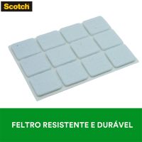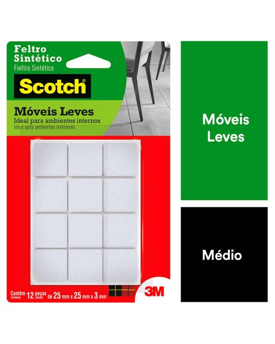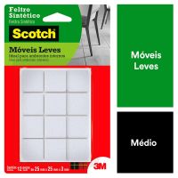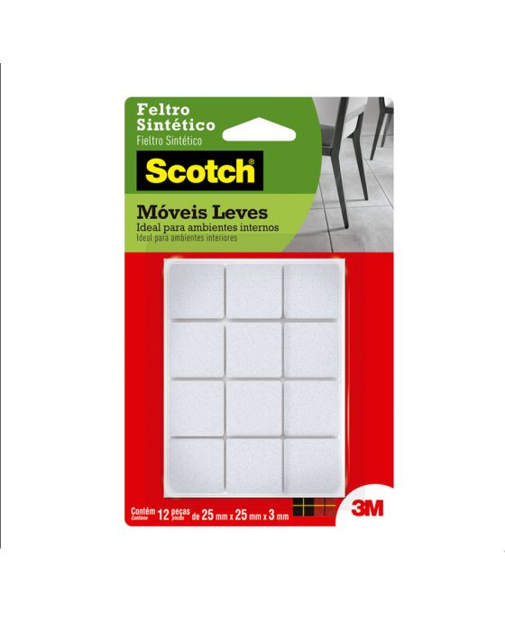 Características:O Feltro Sintético para Móveis Leves 3M Scotch™ ajuda você a proteger a beleza do seu piso. Equipados com adesivo poderoso e feltro durável, os protetores de piso aderem sem esforço aos pés dos seus móveis e fornecem proteção duradoura contra riscos e arranhões.Detalhes:- Marca: Scotch™;- Fabricante: 3M™;- Referência: HB004262596;- Cor: Branco;- Tamanho: Médio;- Formato: Quadrado;- Contém: 1 embalagem do produto com 12 unidades;- Não Risca: Protege e não danifica o piso;- Resistente: Durável;- Ambiente: Interno;- Medidas: 2,5 cm x 2,5cm.Aplicação:- É ideal para aplicar em móveis, como: Mesas, Cadeiras, Banquetas e Pufes.Modo de uso: - As superfícies devem estar limpas, secas e livres de gorduras (ceras, óleos etc);- Remover o liner protetor e aplicar pressionando contra a outra superfície.Uso:- Ideal para evitar que os objetos se desloquem-se, evitando riscos, batidas e deslizamentos. Composição:- Liner: Papel tratado;- Dorso: Feltro Sintético;- Adesivo: Adesivo Sintético.Conteúdo da embalagem: 1 Feltro Moveis Quadrado Branco Medio 25x25mm Scotch 3m.* As especificações podem ser alteradas sem aviso prévio ** Imagem meramente ilustrativa.
